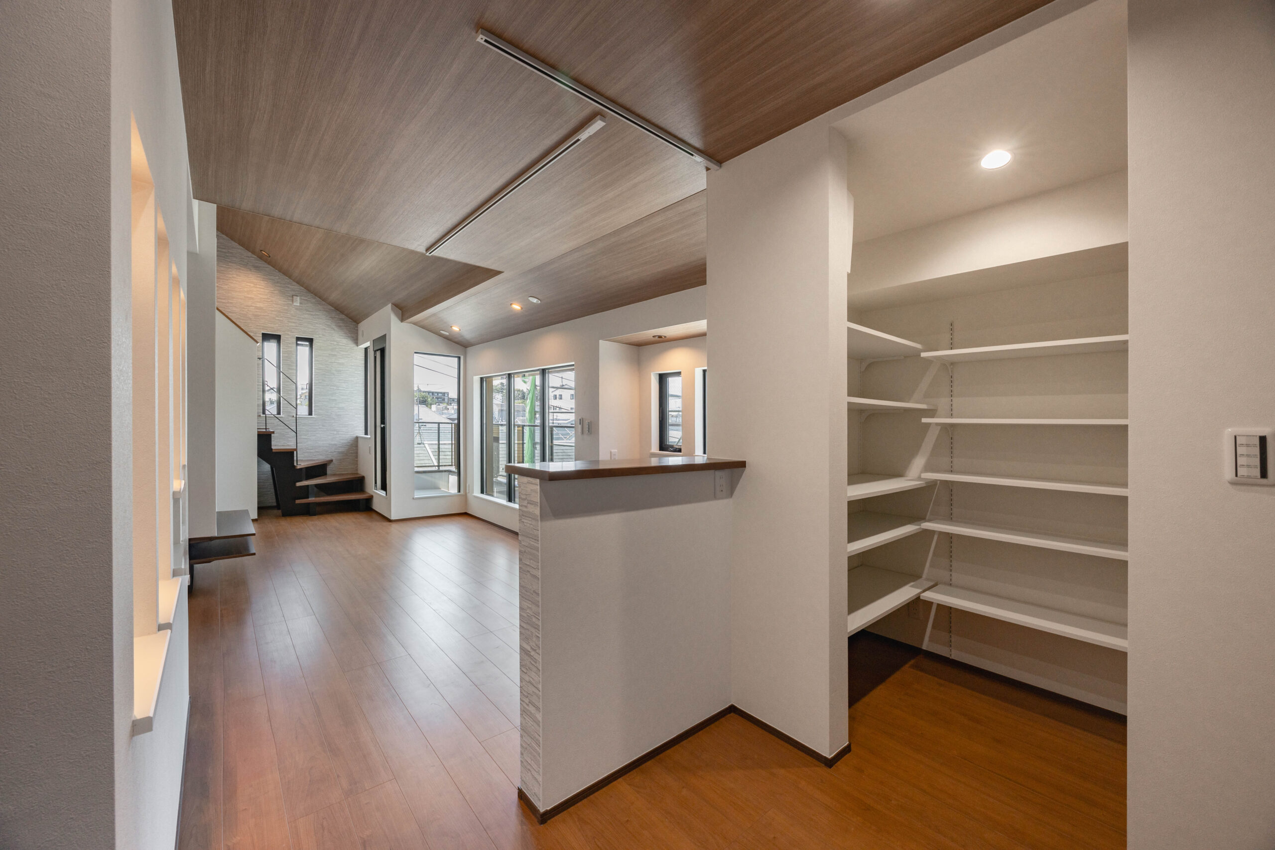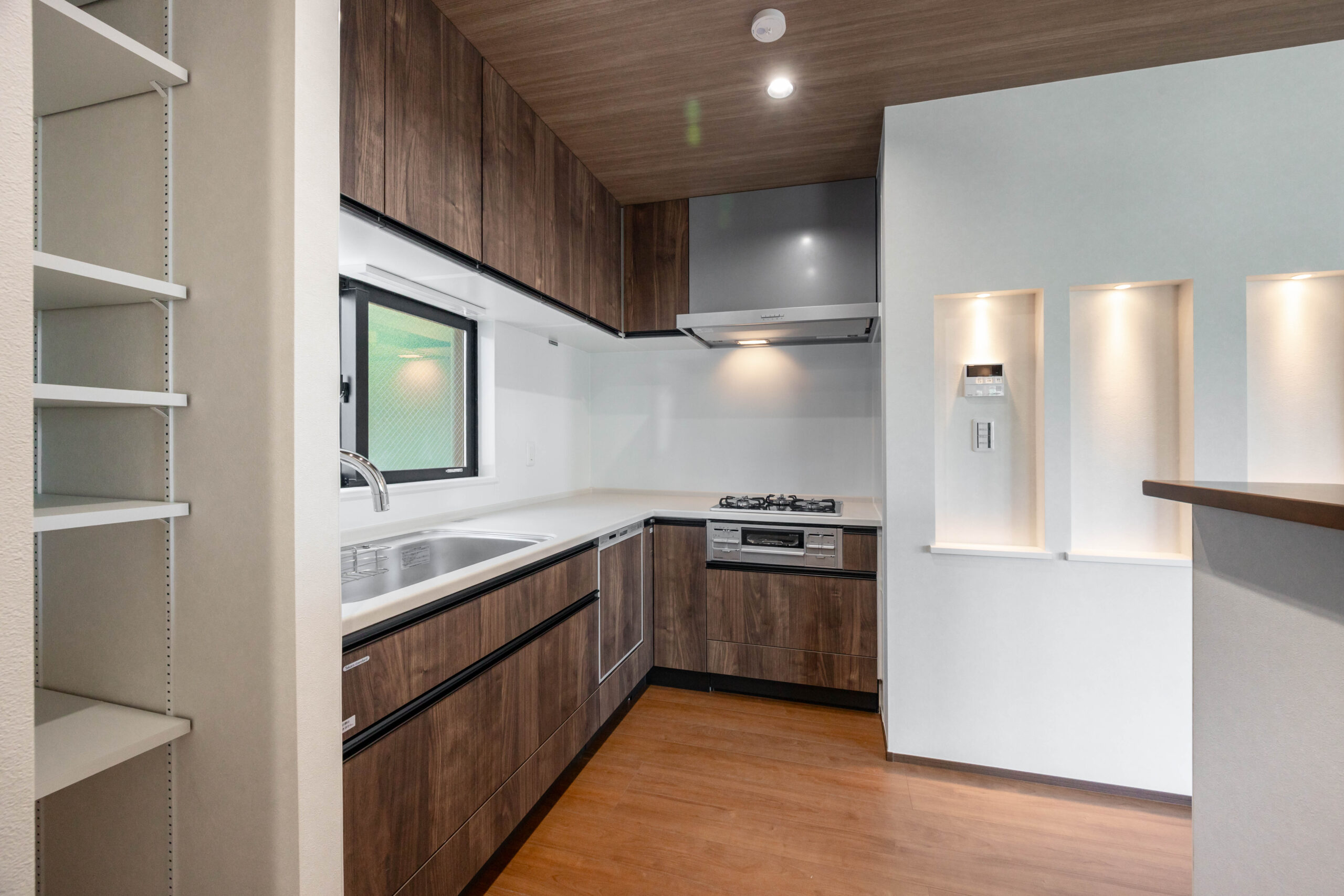 キッチンは収納力の高いL字型を採用。奥には可動棚付きのパントリーを設け、食材や日用品を整理しやすい構成としている。加えてカウンター収納も設置し、日常的に使う物の出し入れを想定した計画となっている。