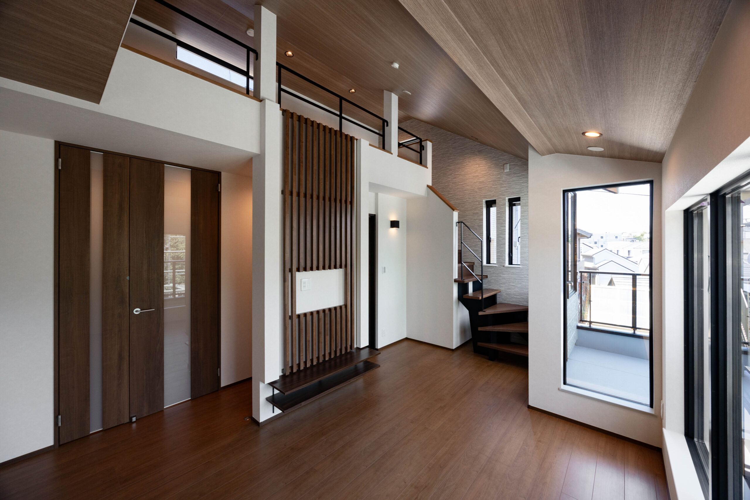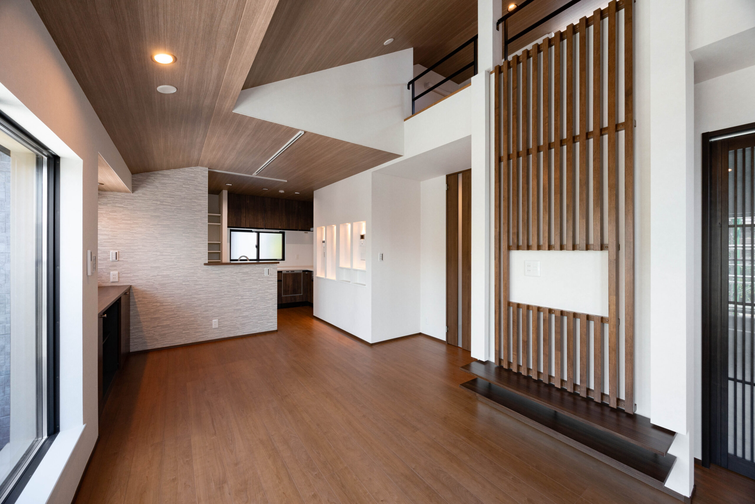 2階には約17帖のLDKを配置。隣接して4帖の独立した和室を設け、多用途に活用できる空間構成とした。さらに、勾配天井を活かしたロフトを設置。LDKを見下ろせる位置関係とすることで、空間に立体的な広がりを生み出している。