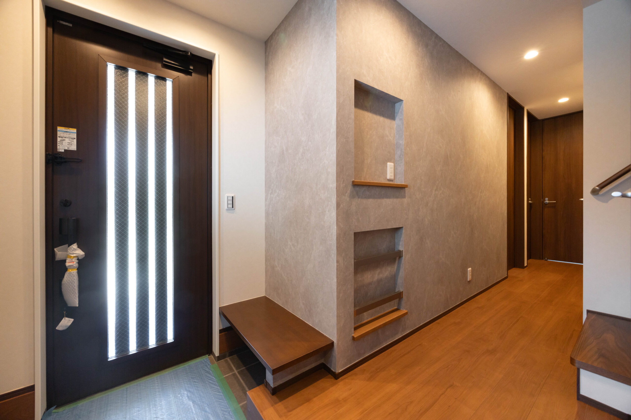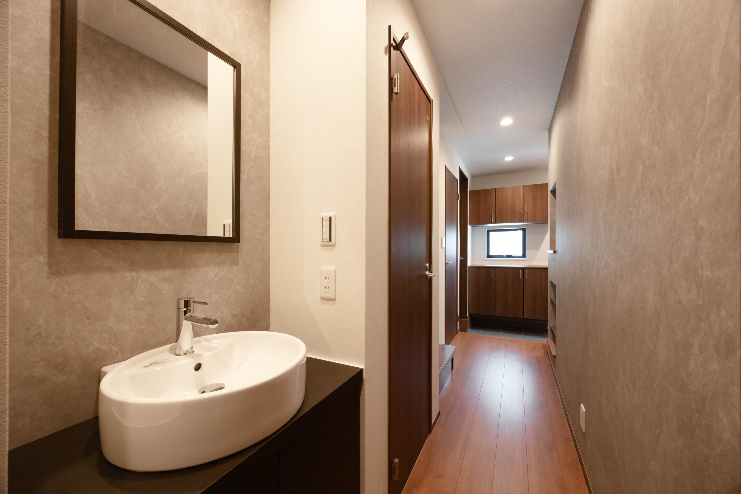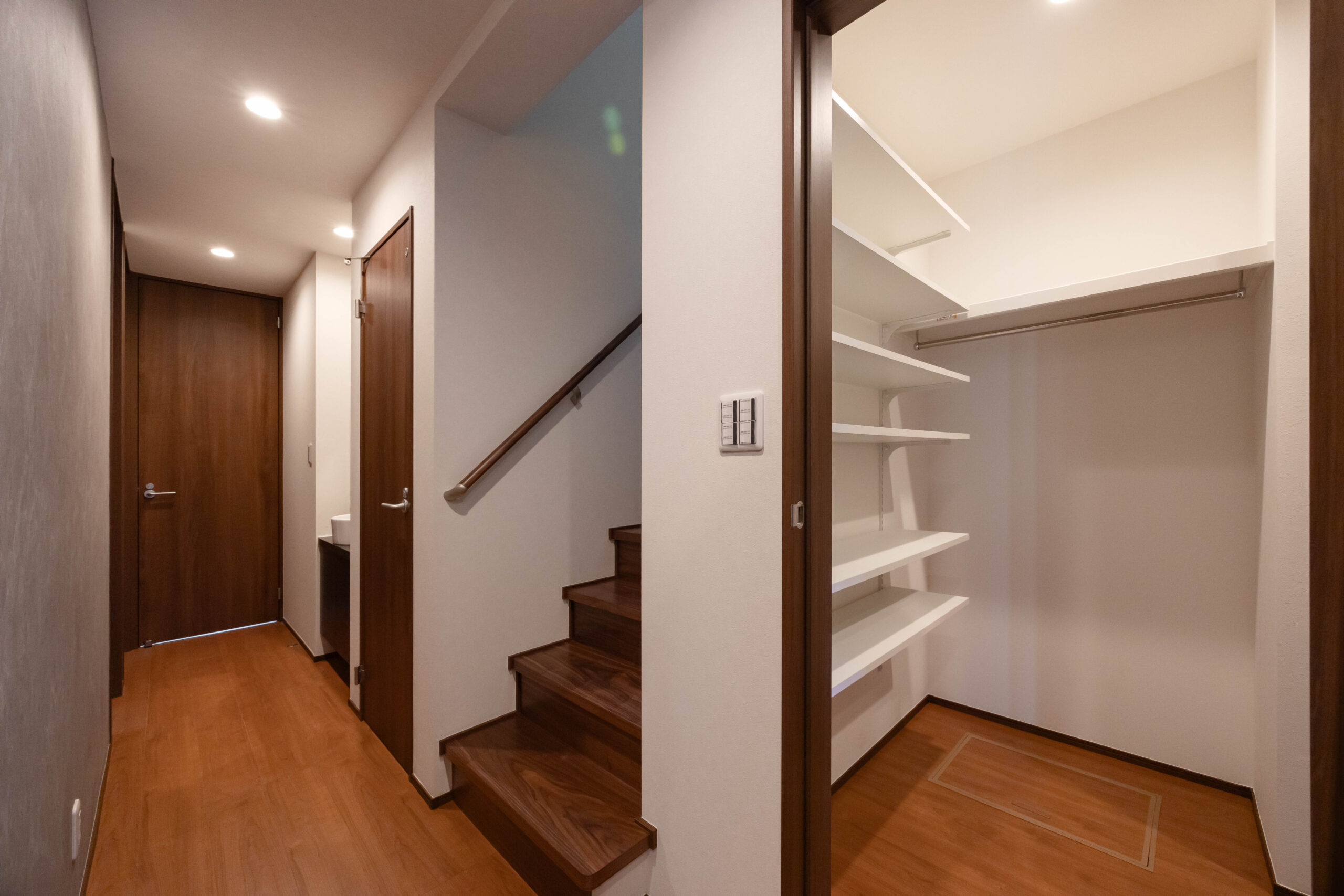 玄関はゆとりある広さを確保し、ベンチとシューズインクローゼット(SIC)を設置。外出と帰宅の動作がスムーズに行える計画とした。さらに1階廊下には洗面台を配置し、帰宅後すぐに手洗いができる動線を確保。生活導線と衛生面の両立を図っている。