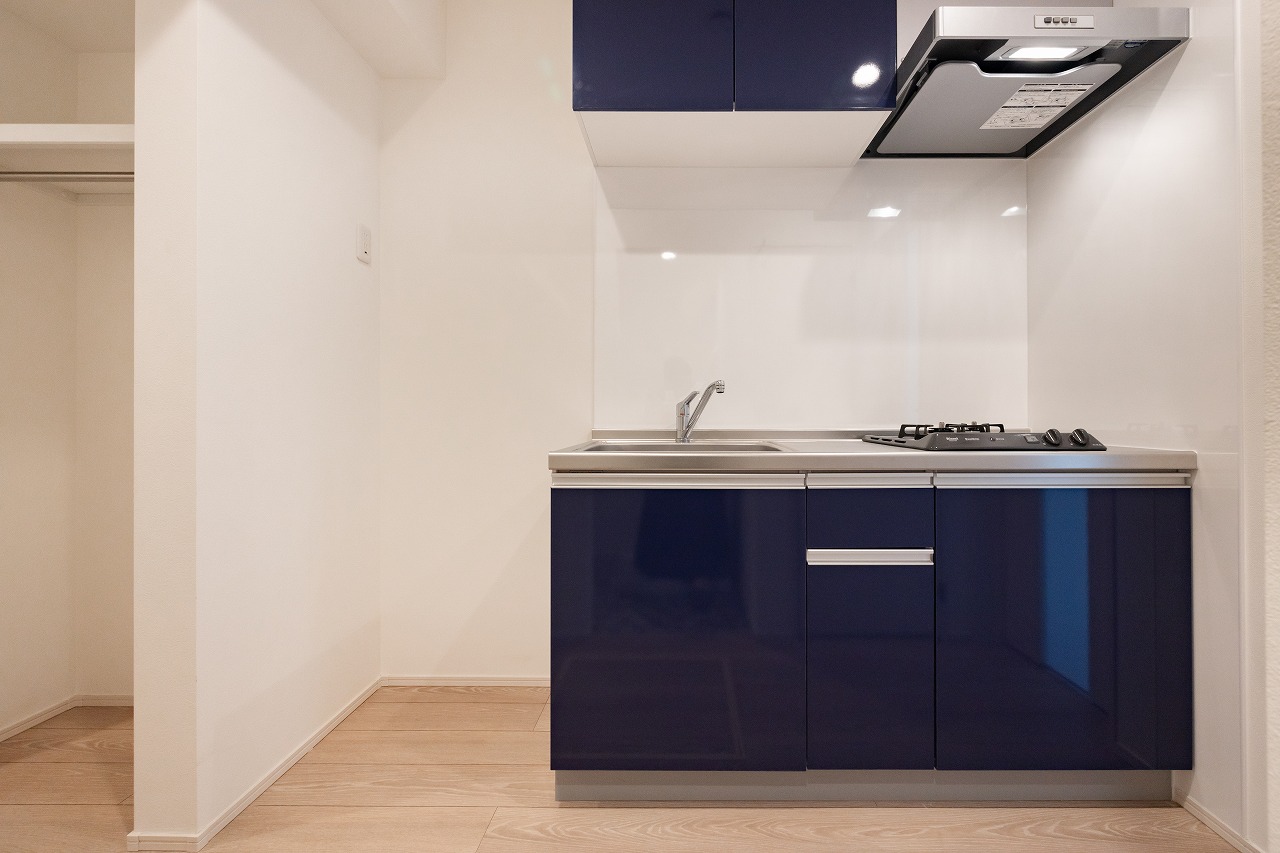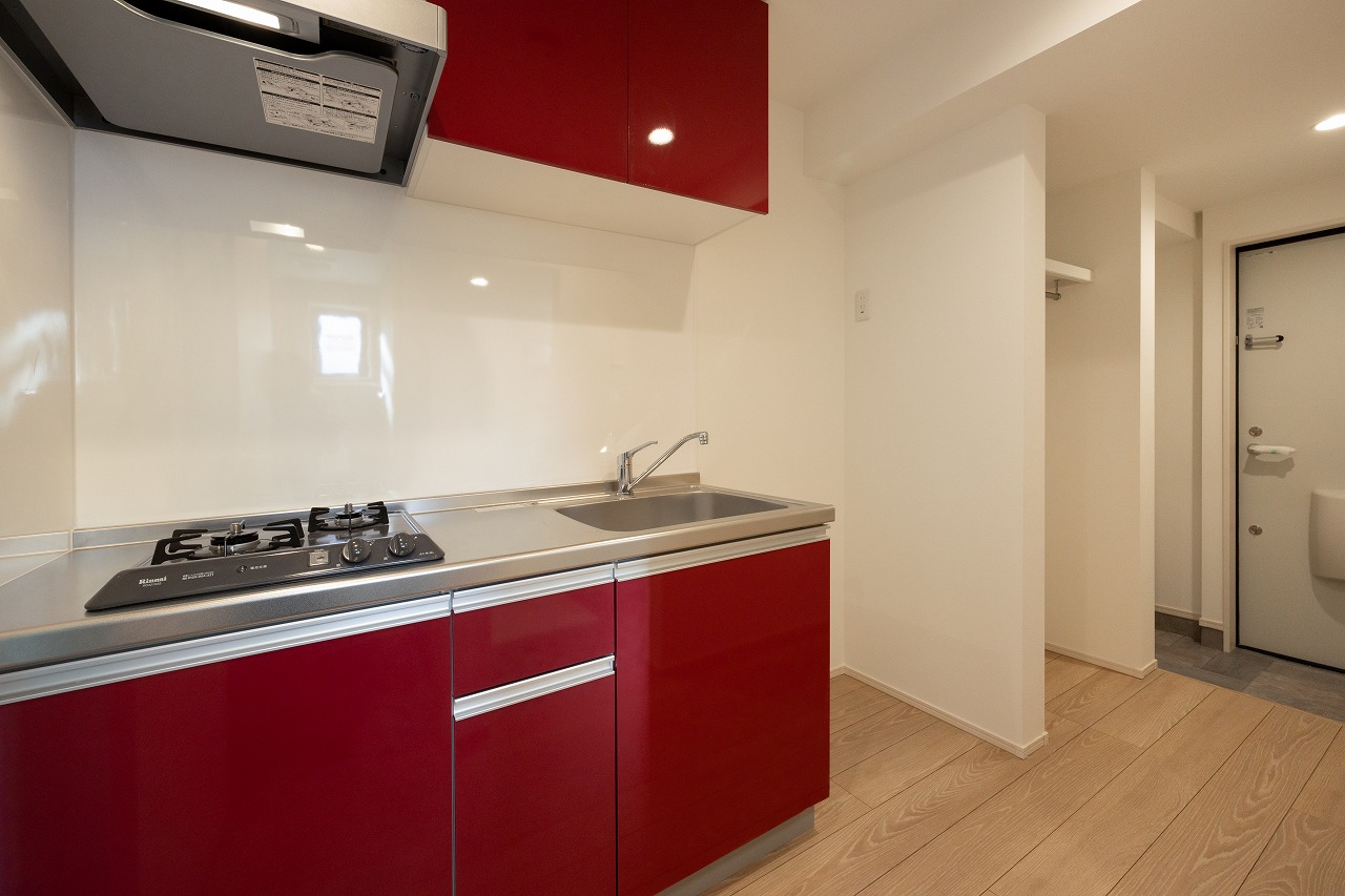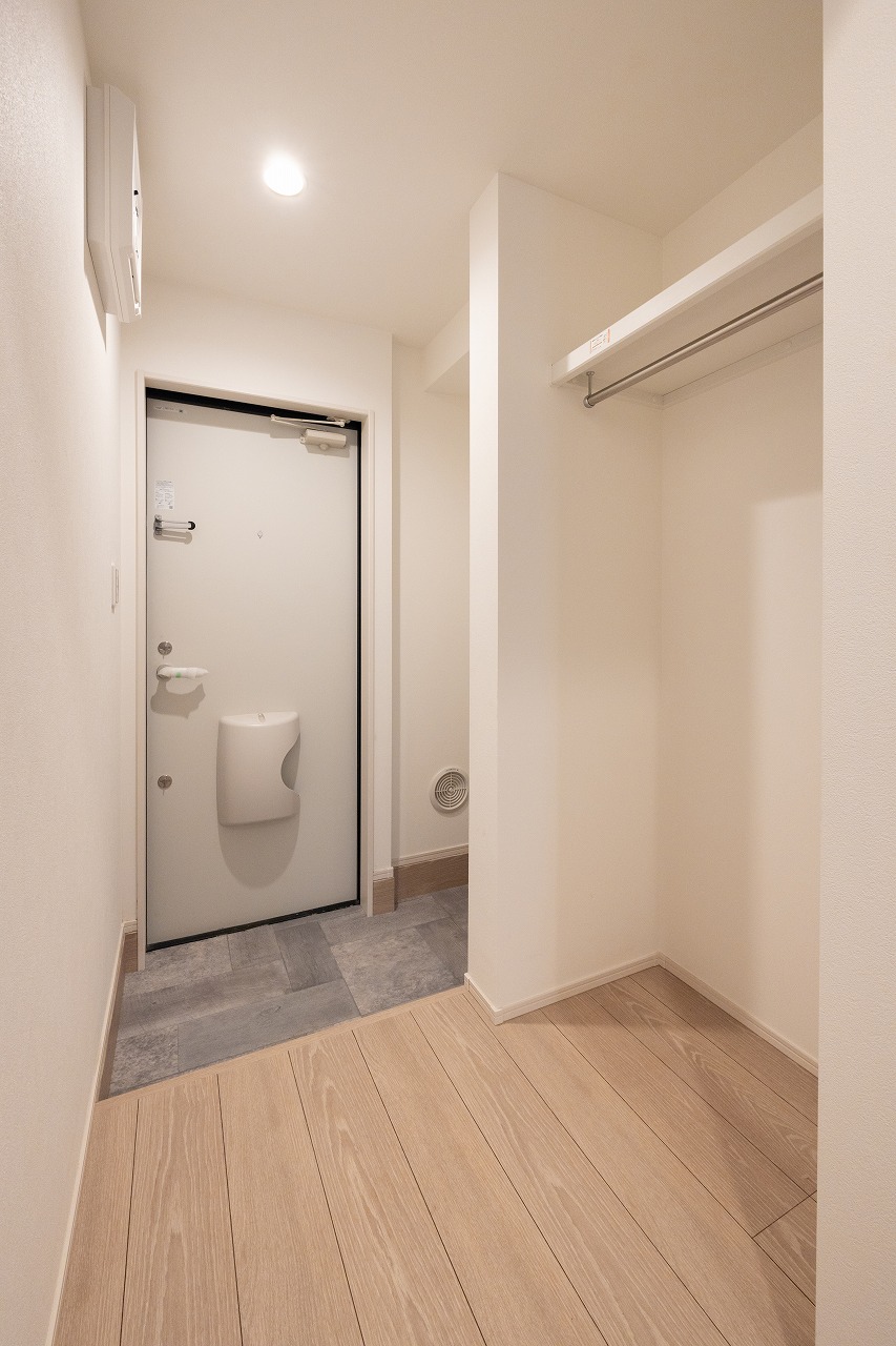 特徴の一つが玄関まわりの収納計画だ。広めの土間収納を設け、その横にはコード類などを掛けられるスペースを確保。備え付けのシューズボックスに収まりきらない靴や、大学の部活動で使用するスポーツ用品などの収納にも対応できる構成となっている。一般的な1Kとは異なる収納づくりが意識されている。
