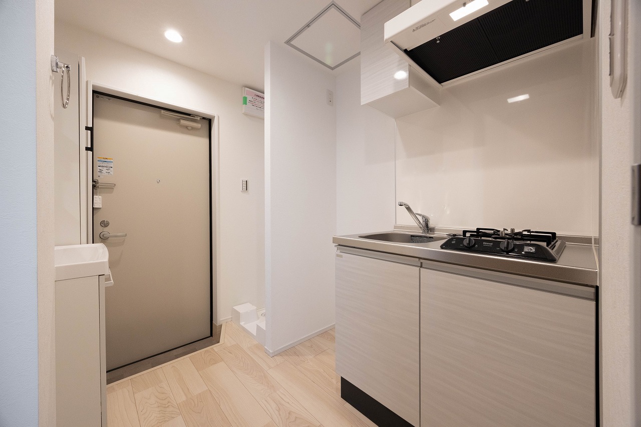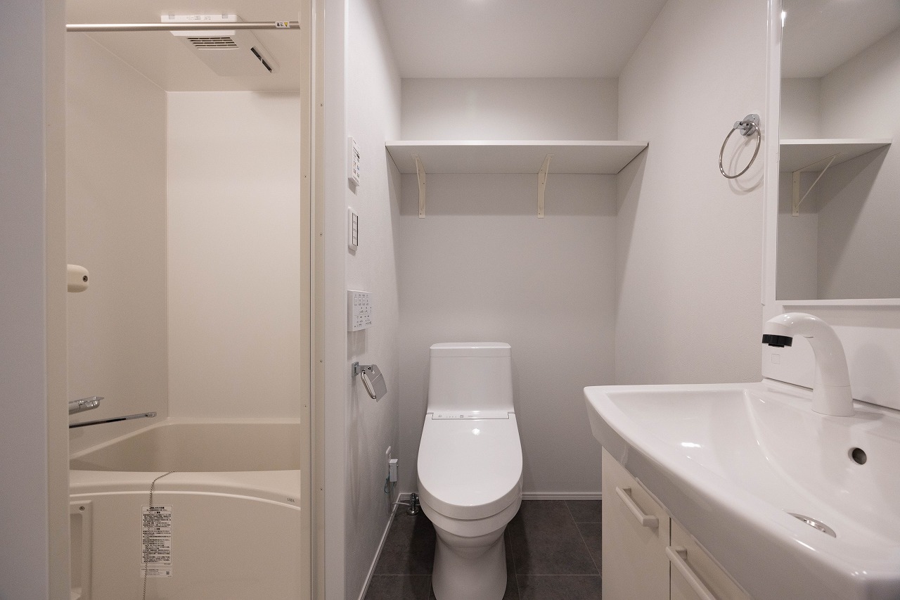 バストイレ別、独立洗面台、二口コンロ、室内洗濯機置き場を設置し、浴室乾燥機も完備。初めての一人暮らしでも使いやすい設備構成となっている。