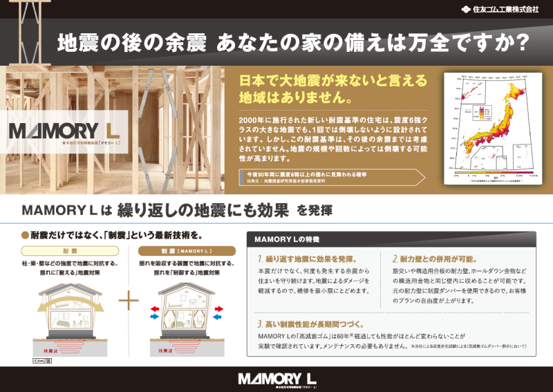 制震装置といってもさまざまなメーカーやタイプがありますが、弊社では住友ゴム工業の「MAMORY(マモリー)」シリーズを採用しています。