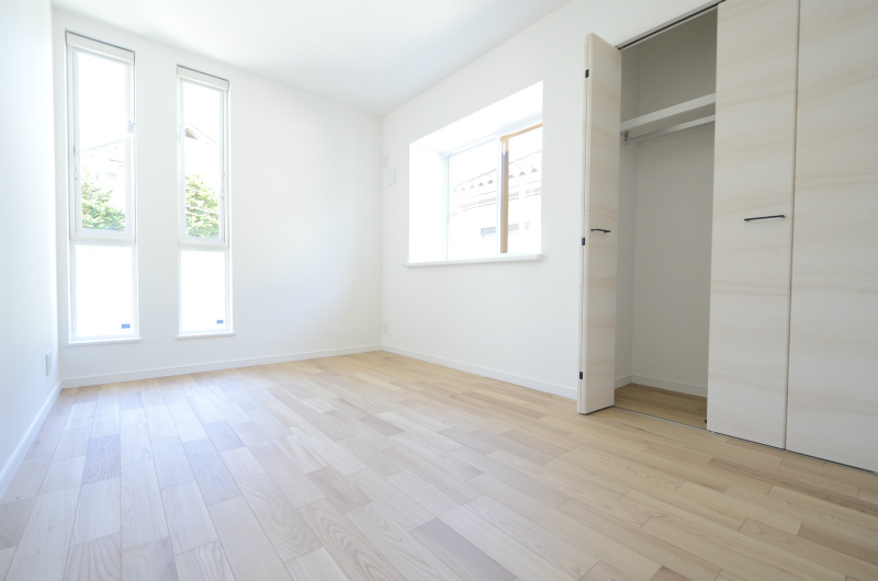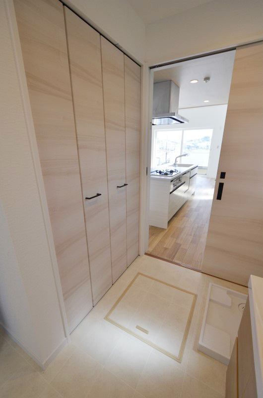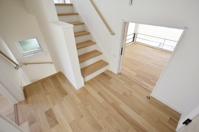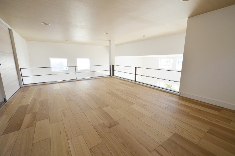 本物件は、収納力と立地特性を最大限に活かして計画された川崎市多摩区の建売住宅である。約20畳のLDKは吹き抜けと勾配天井を組み合わせた開放的な空間構成とし、キッチン上部には納戸を設けることで、立体的に空間を活用。2つの納戸へは階段で直接アクセスできるため、大きな荷物の出し入れもスムーズに行える設計となっている。