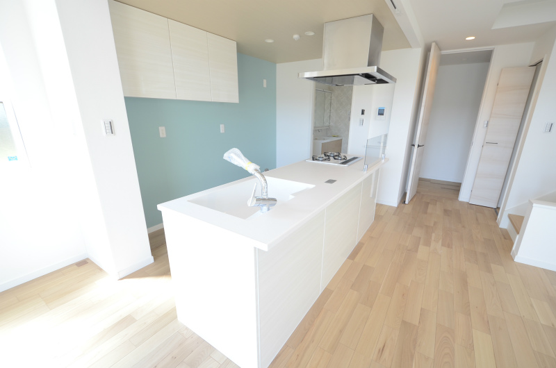 キッチンには人気のアイランドキッチンを採用。浴室・洗面室・キッチンを一直線につなぐことで、料理と洗濯を並行して行える効率的な家事動線を実現している。