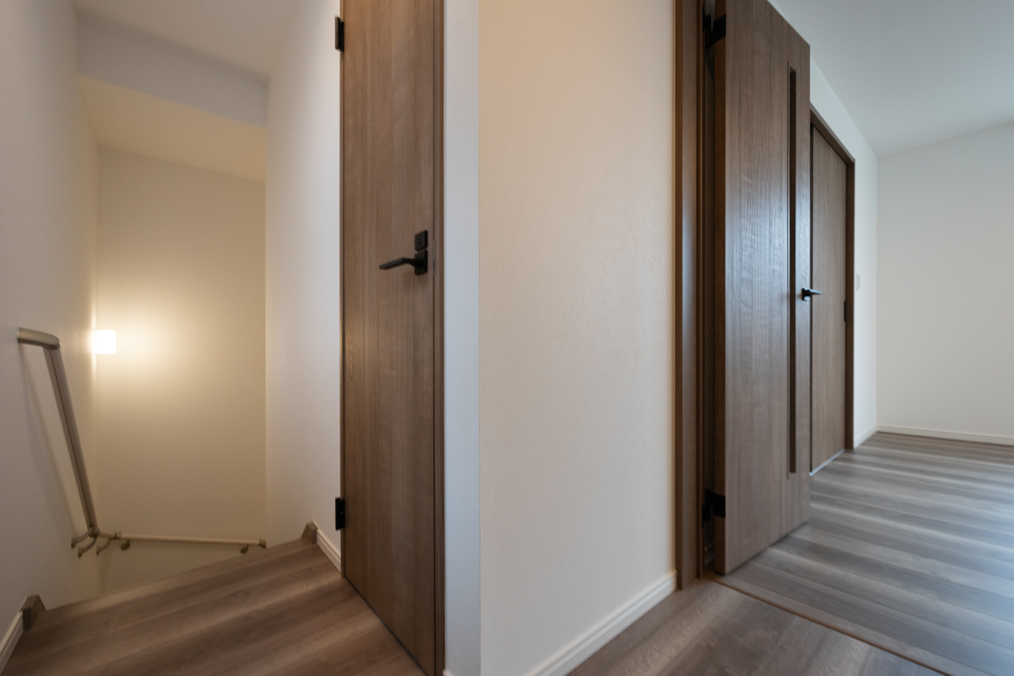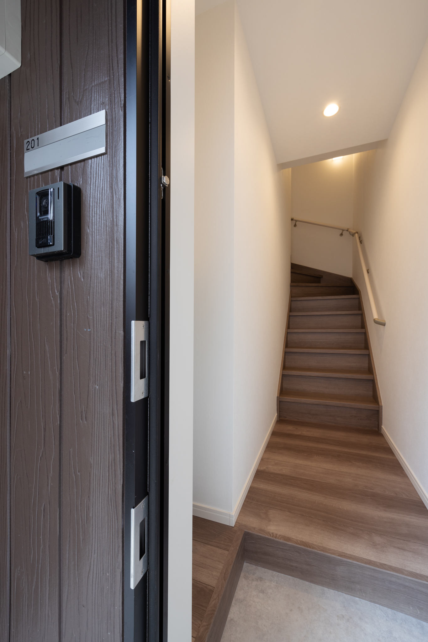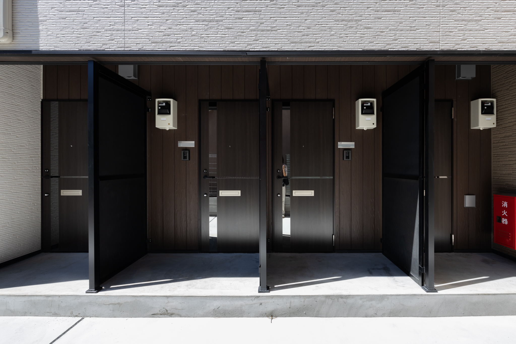 住戸構成は、1階に1Kを2戸、2階に1DKと1LDKを各1戸ずつ配置。長屋形式を活かすことで、全戸角部屋を実現している。隣戸との接点を最小限に抑え、採光や通風の面でも有利な計画となっている。
