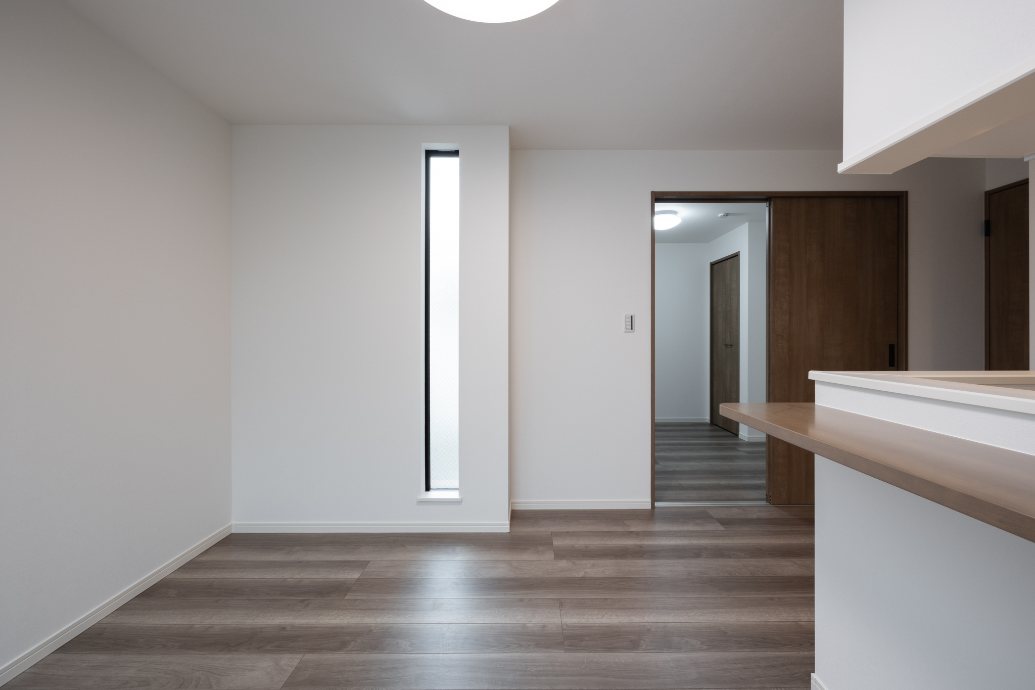 敷地は、道路に接する部分が細長い旗竿地形状。一般的には不利とされがちな条件であるが、本計画ではこれを静かな住環境を確保する要素として活用した。道路から建物までの距離が確保されるため、通行人の視線や車両騒音の影響を受けにくい。都内でありながら落ち着いた居住環境を実現している。