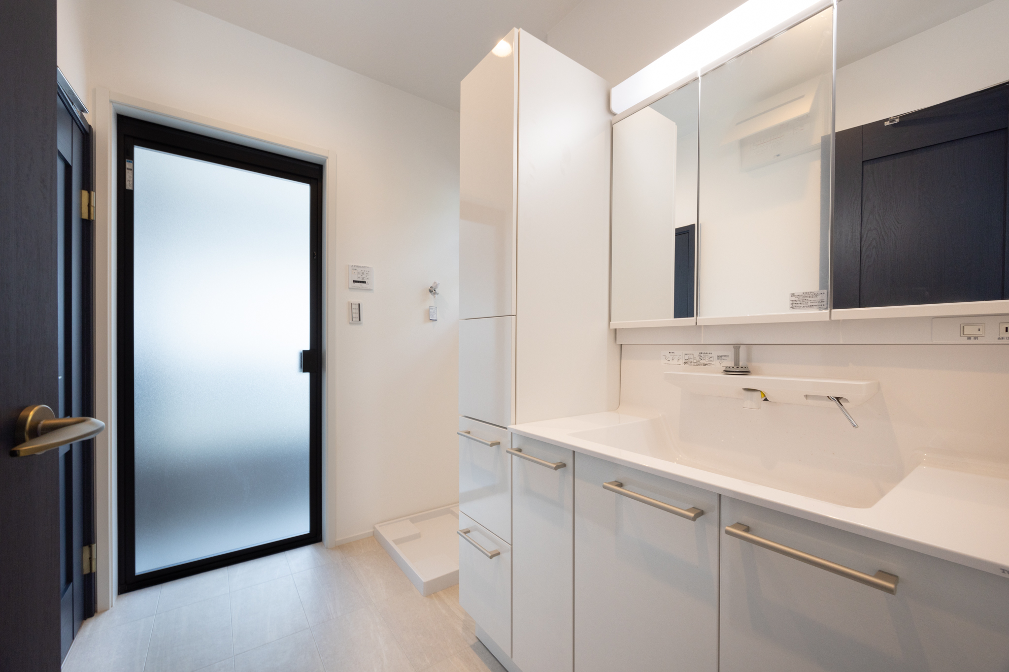 水回り動線も特徴的だ。洗面室へはキッチン側からも廊下側からもアクセスできる回遊型の配置とし、家事効率を高めている。料理と洗濯を並行しやすく、家族が自然に家事へ参加できる構成だ。結果として、家事時間の短縮だけでなく、家族の団らん時間の創出にもつながるプランとなっている。