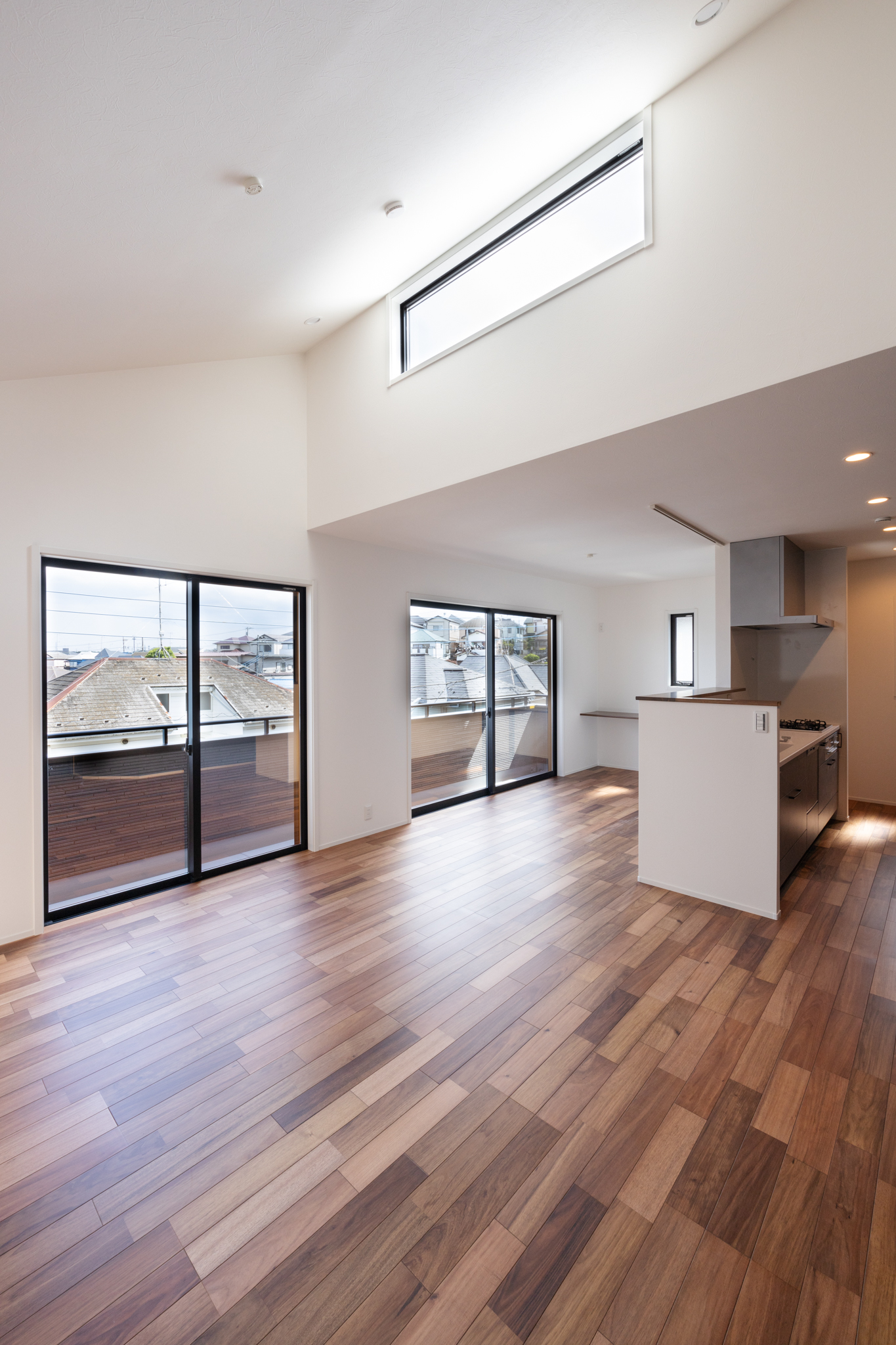 リビングに連続するバルコニーは、床高さを室内より一段低く設定し、上部に手すりを設けることで、家事中・食事中・くつろぎの時間のいずれにおいても自然と外の景色を楽しめるつくりとした。屋内外のつながりを意識した設計が、この住まいの大きな魅力となっている。