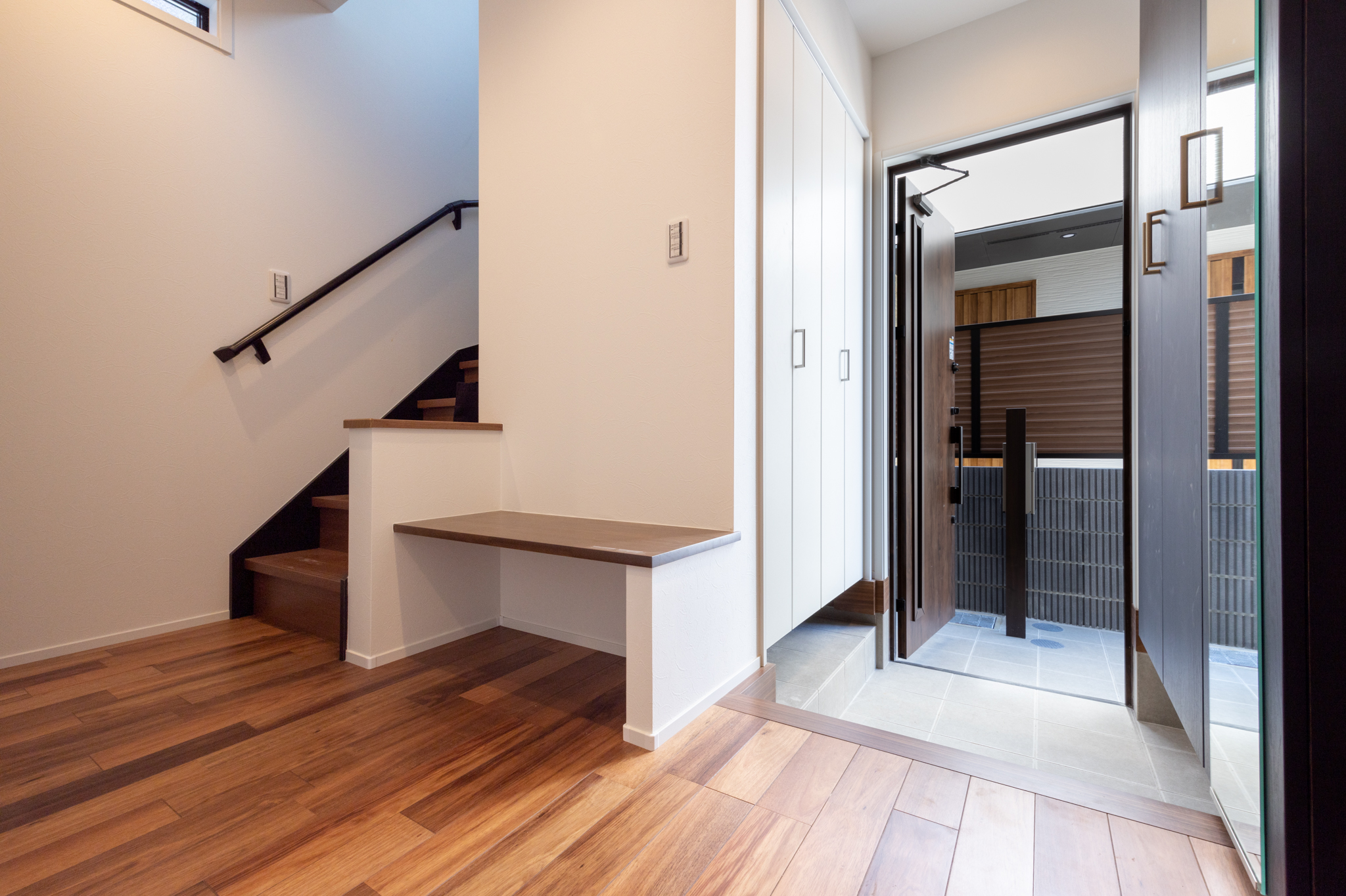 玄関横には、階段下スペースを有効活用したシューズインクローゼットを配置。限られた面積を無駄なく活かしながら、靴だけでなくベビーカーやアウトドア用品なども収納できる容量を確保した。さらに玄関脇にはベンチを設け、買い物帰りに腰を掛けて荷物を整理できるなど、細やかな配慮が感じられる設計である。