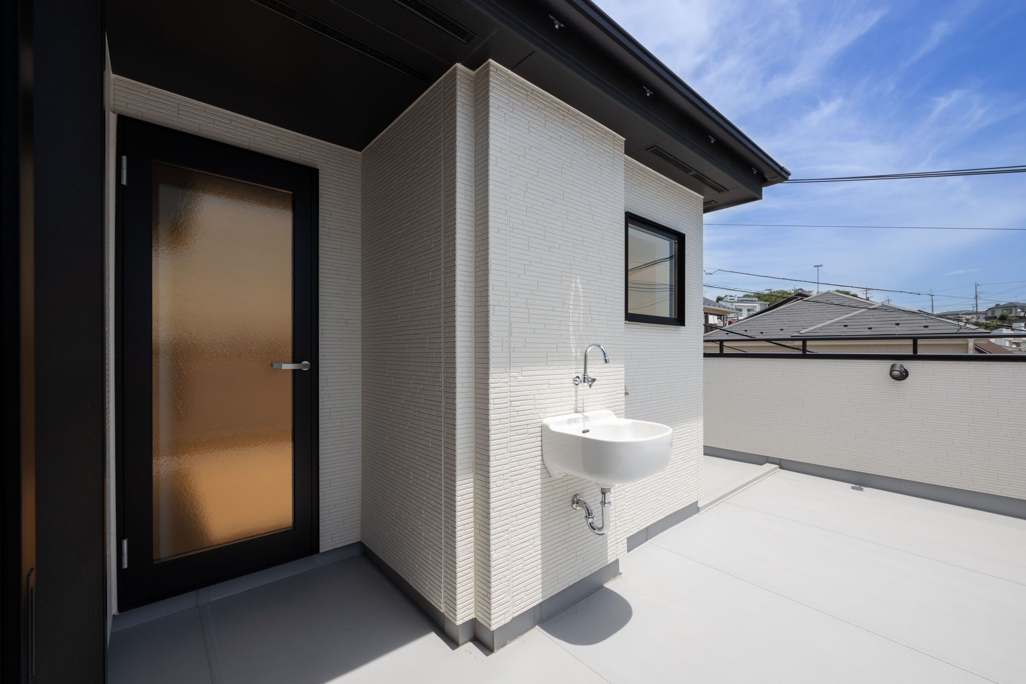 13帖超のスカイバルコニーは2つの寝室と直結し、水栓と照明を完備。屋外でありながら生活空間の延長として使える設計とし、前庭・中庭とあわせて、外部空間に多層的な広がりを持たせた。