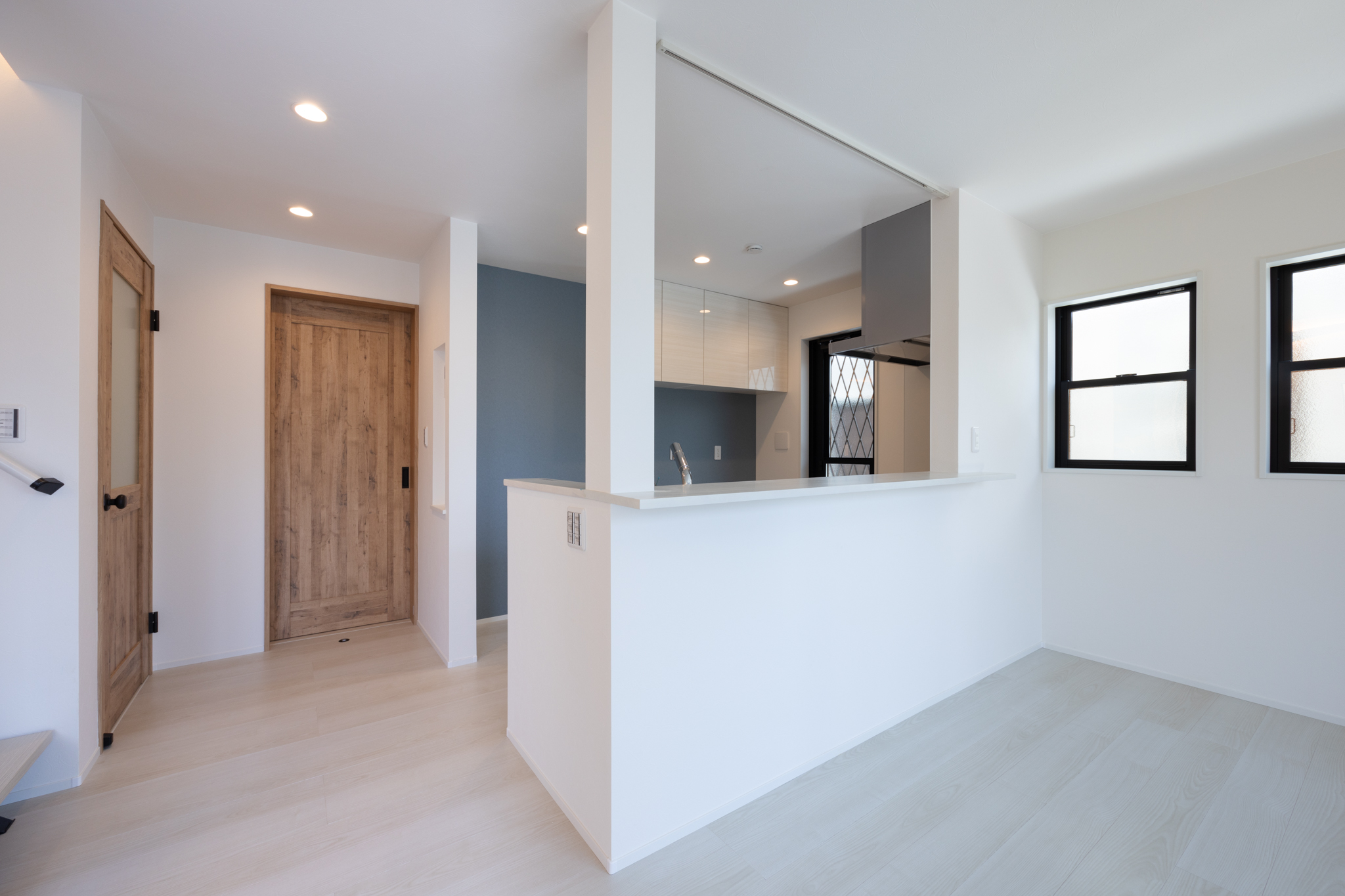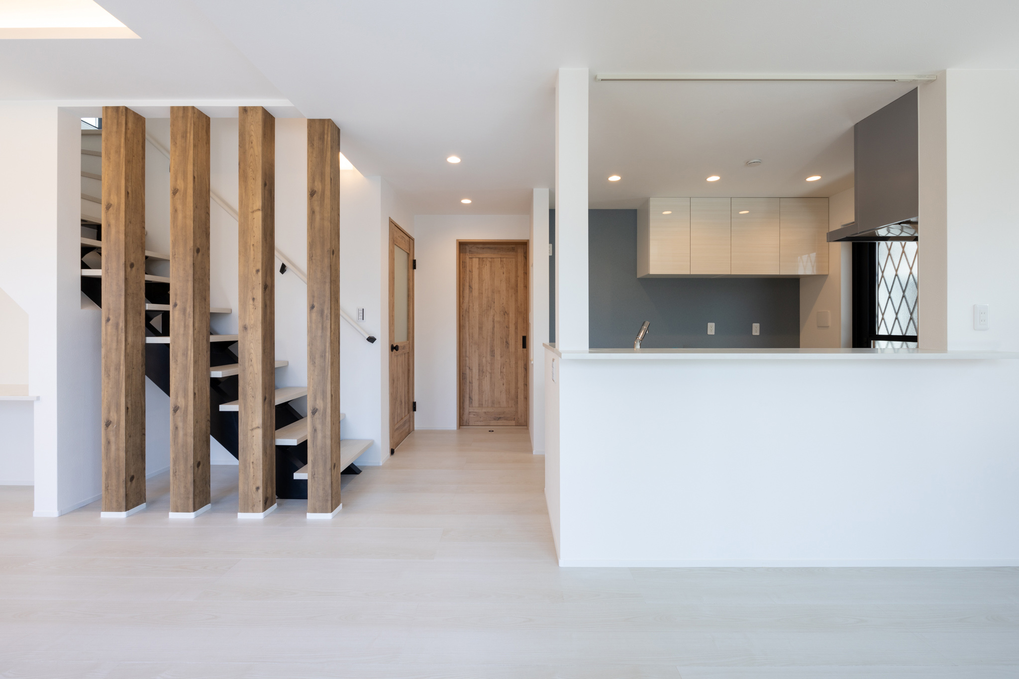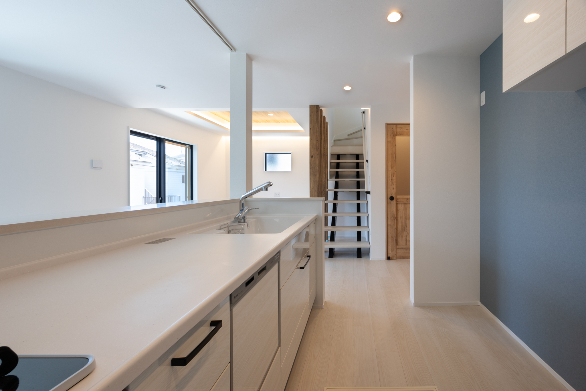 住まいの中心となるLDKは、リビング階段を採用した三面採光の空間構成とし、家族が自然と集い、顔を合わせる時間が生まれやすい設計とした。玄関からキッチンへの動線もスムーズで、日々の家事を意識した配置となっている。