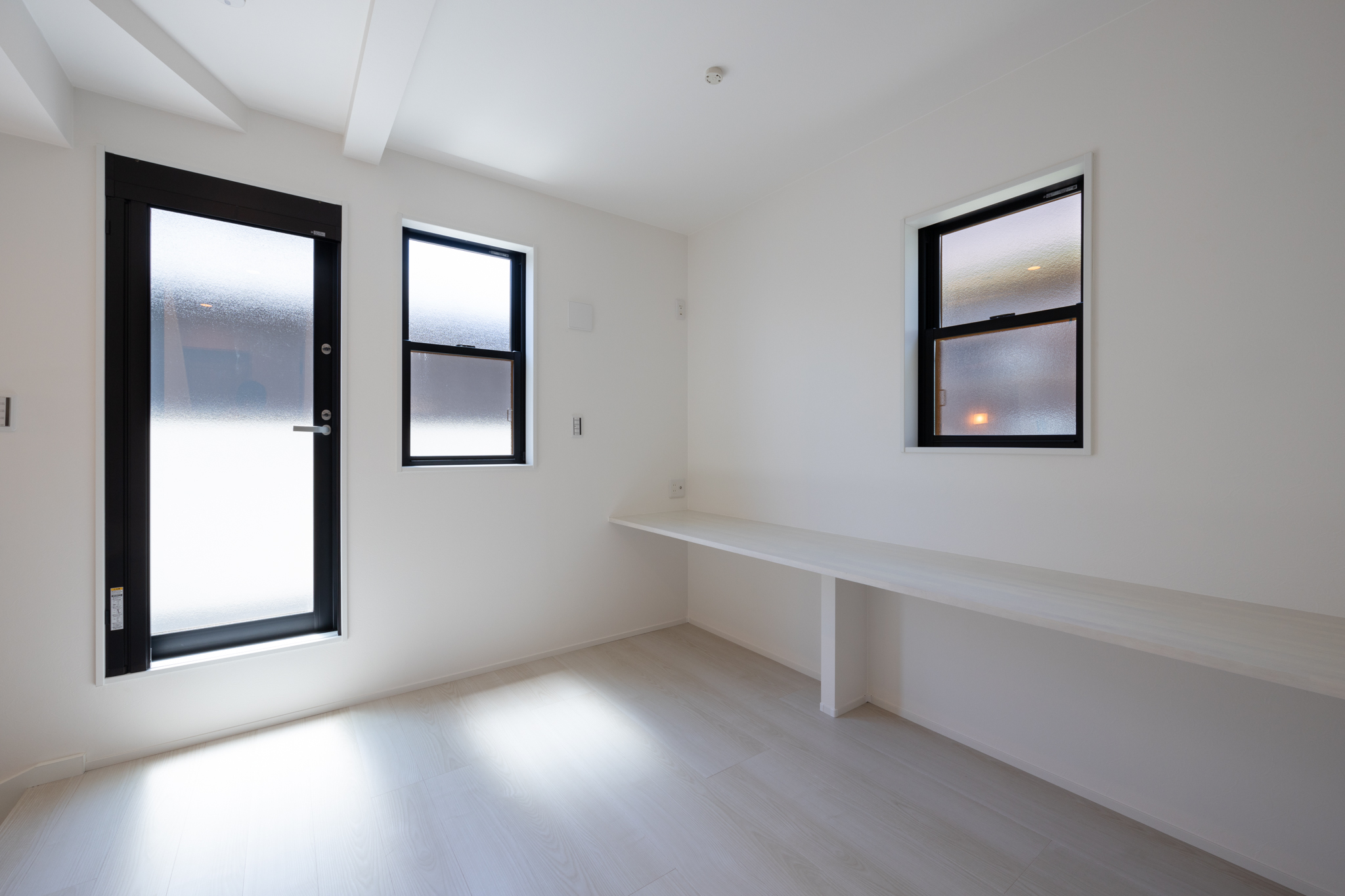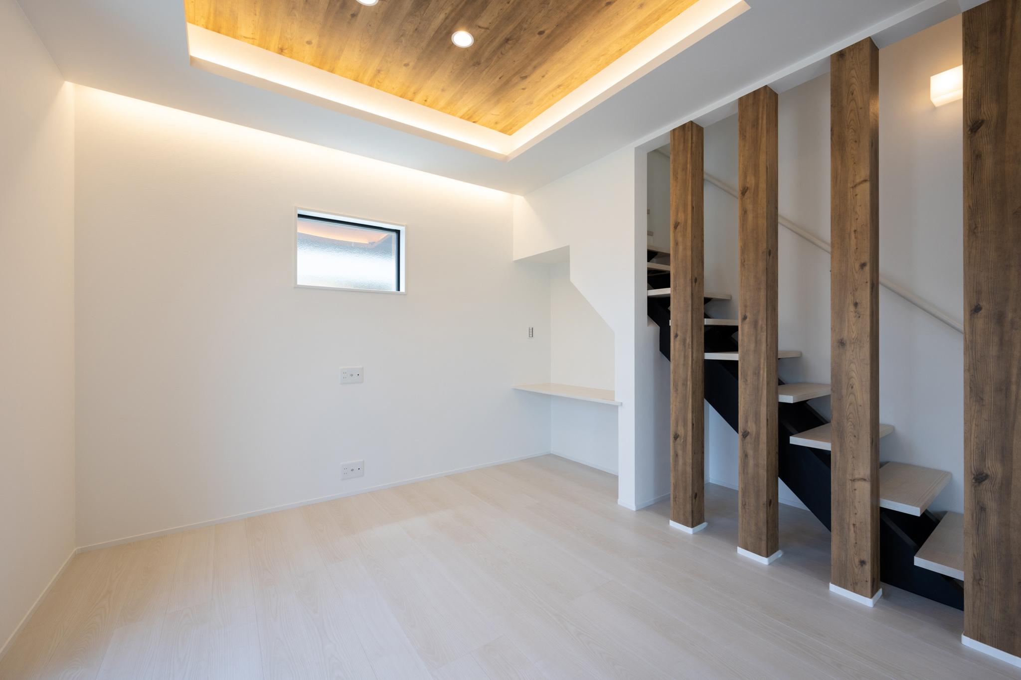 2階には、カウンター付きの約4.9帖のフリースペースを設け、ファミリーラウンジとしてはもちろん、在宅ワークや副業、趣味のスペースなど、暮らしの変化に応じて柔軟に使える余白を用意。階段下の空間も、玄関収納やリビング側カウンターとして活用し、限られた面積を無駄なく使い切っている。
