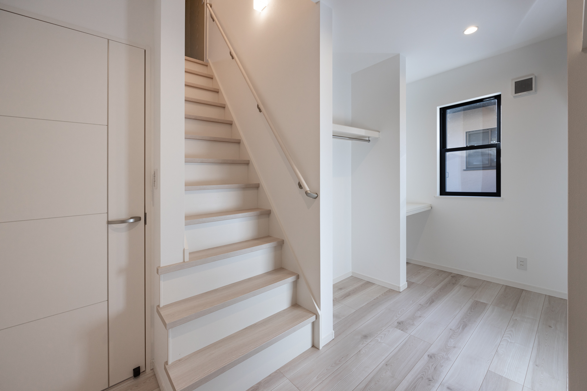 リビングから2階へ上がる踊り場にはワークスペースを配置し、仕事に集中しながらも家族の様子が自然と視界に入る設計とした。さらに、ロフトと直結するファミリークローゼットを設け、季節ごとの衣類管理と収納を一連の動線で完結できるようにしている。