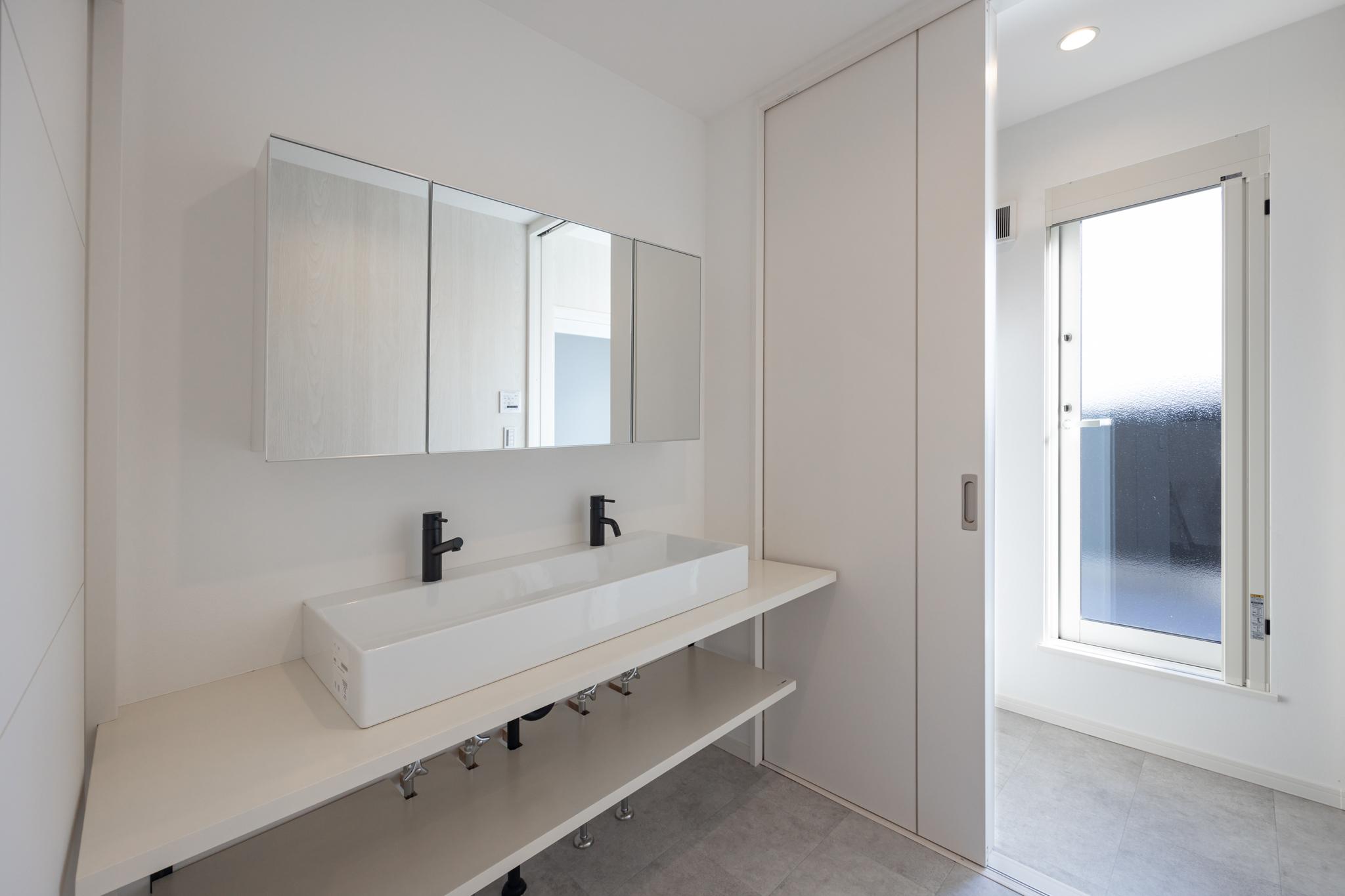 水まわりでは、2水栓を備えたワイドな洗面台を採用し、朝の混雑を緩和。洗濯機置き場のすぐ横にはバルコニーへの動線を確保し、脱水後すぐに外干しができる実用的な配置としている。