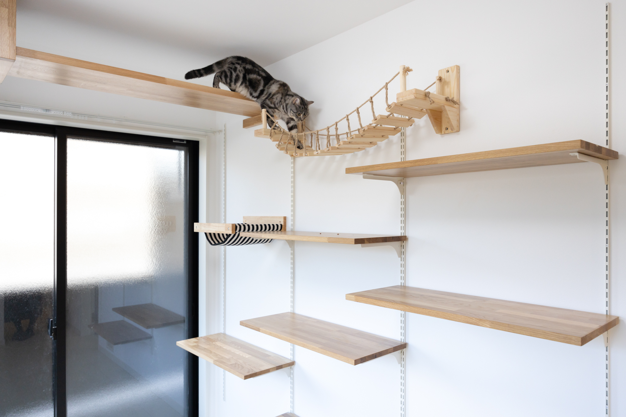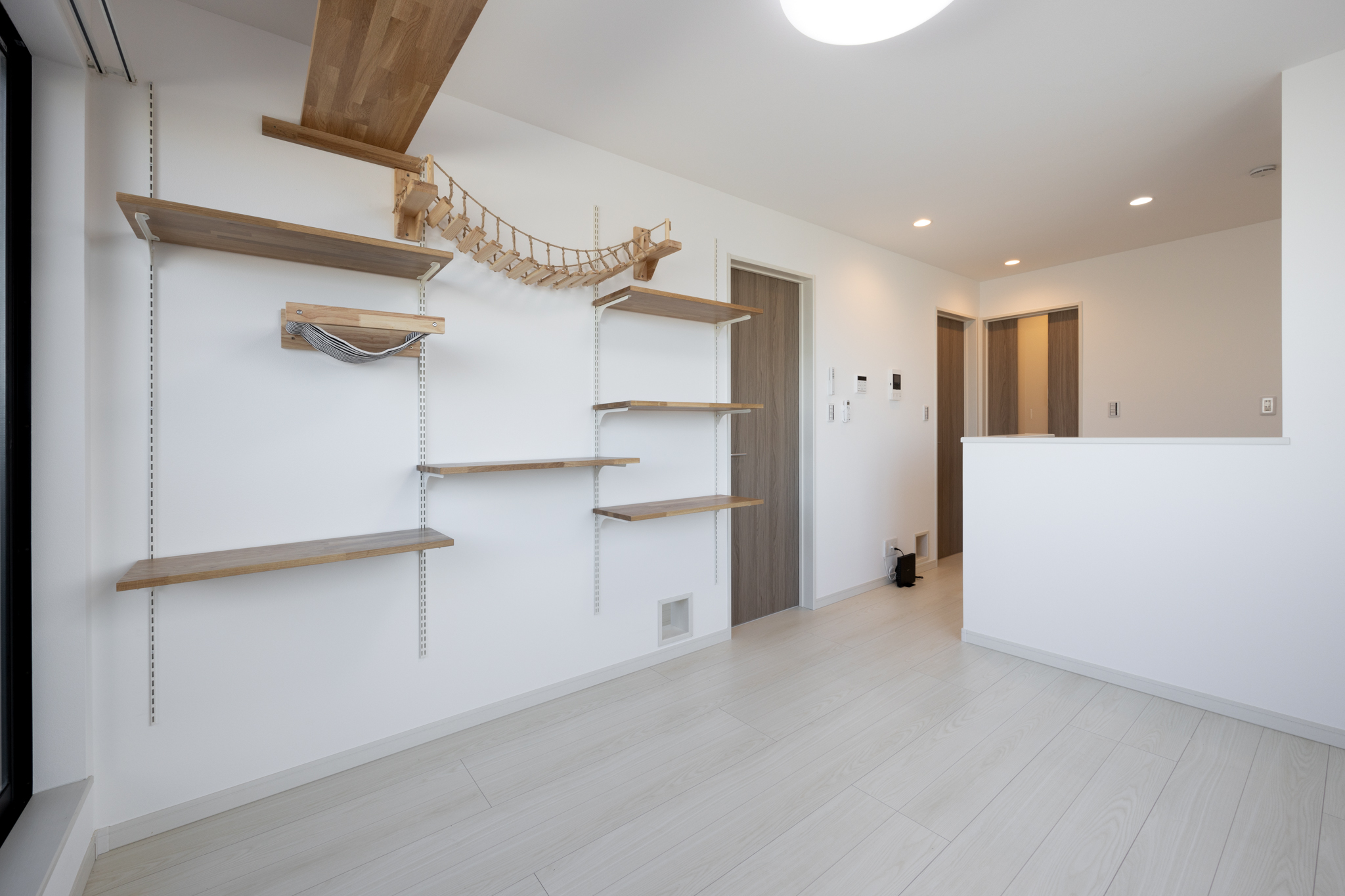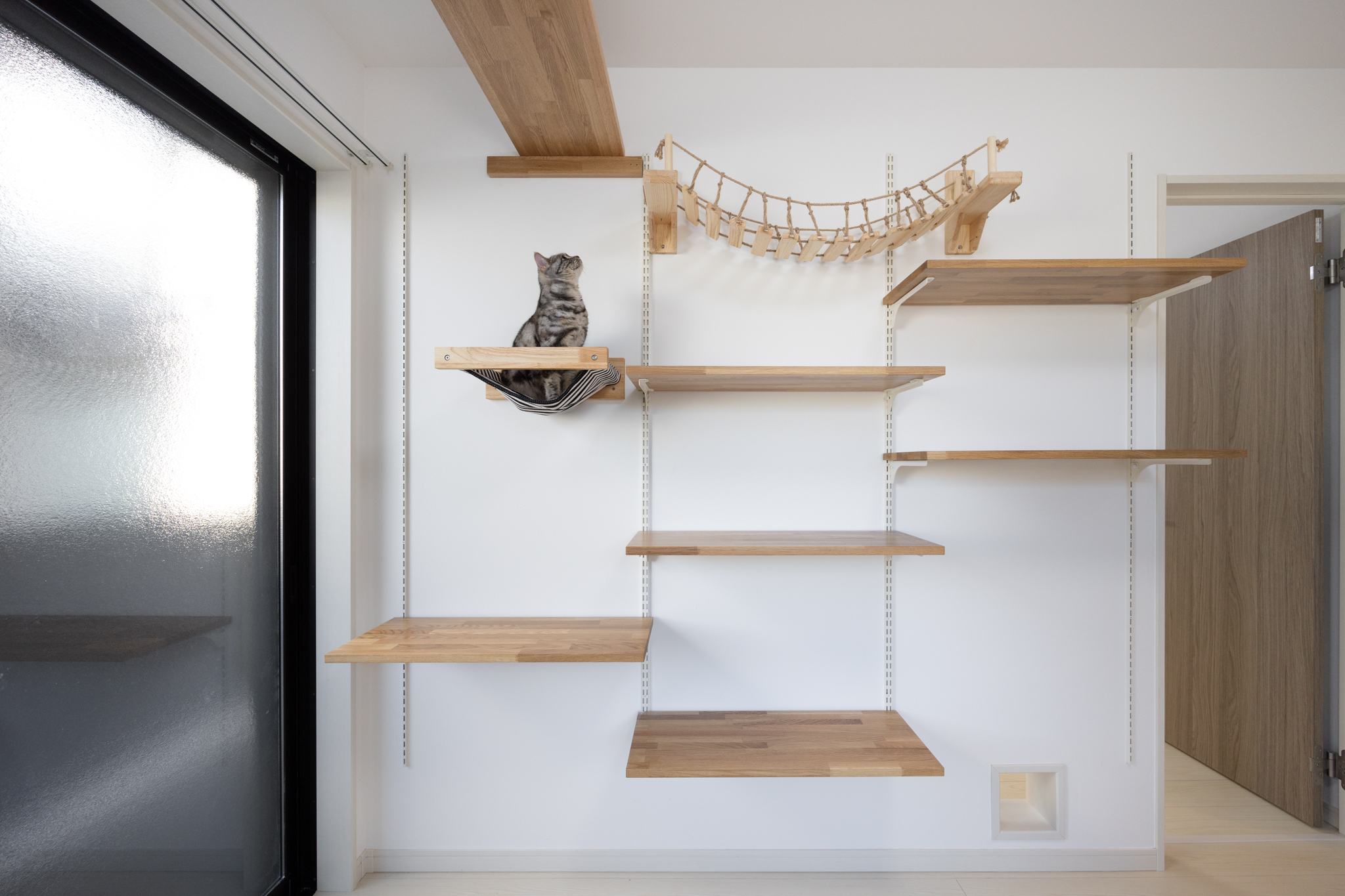 人の暮らしにおいても過度な制限を感じさせないよう、ねこ専用設備は空間に溶け込むデザインとした。ねこのための工夫が、人の居住性を損なわないことを前提に設計している点が本物件の特徴である。