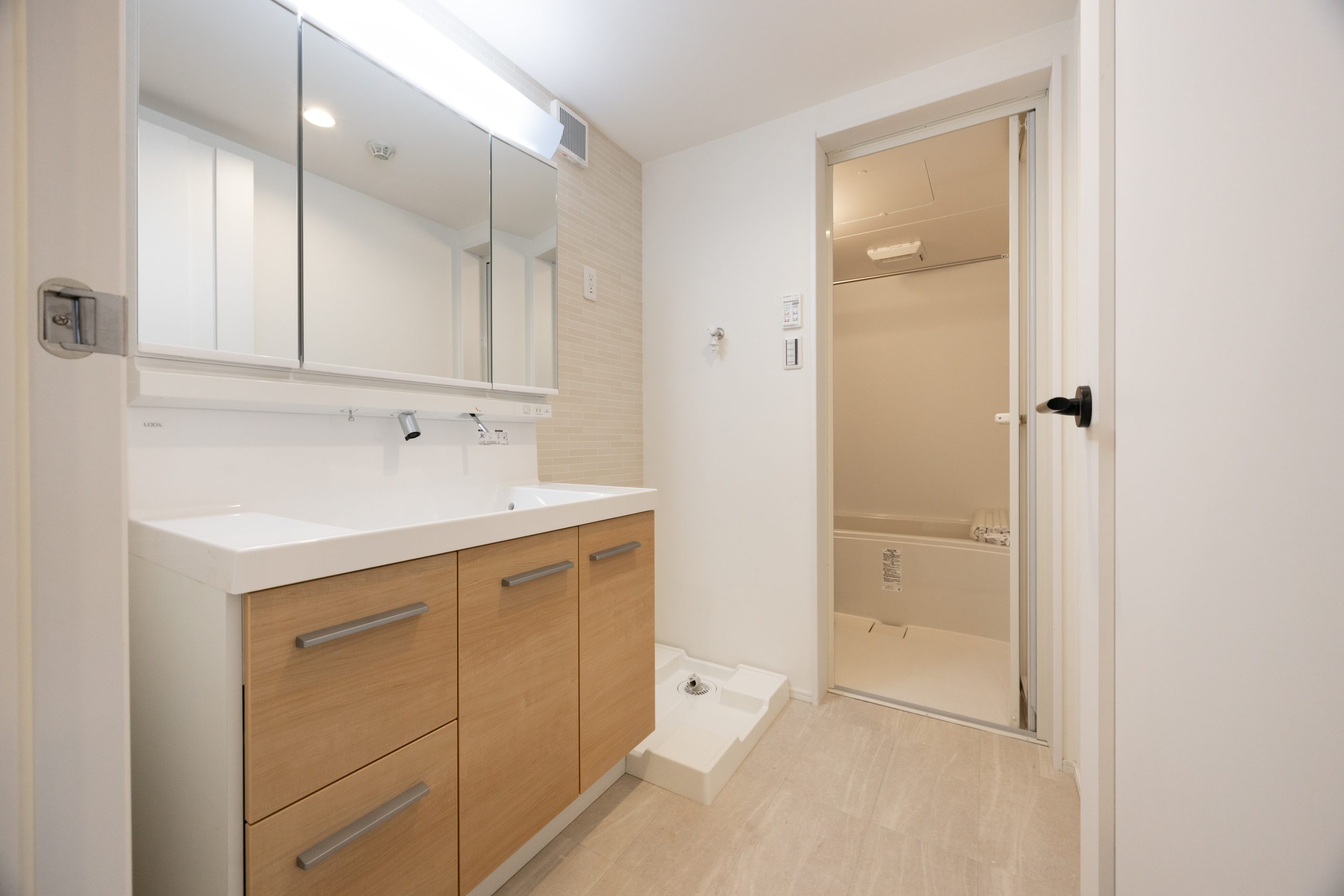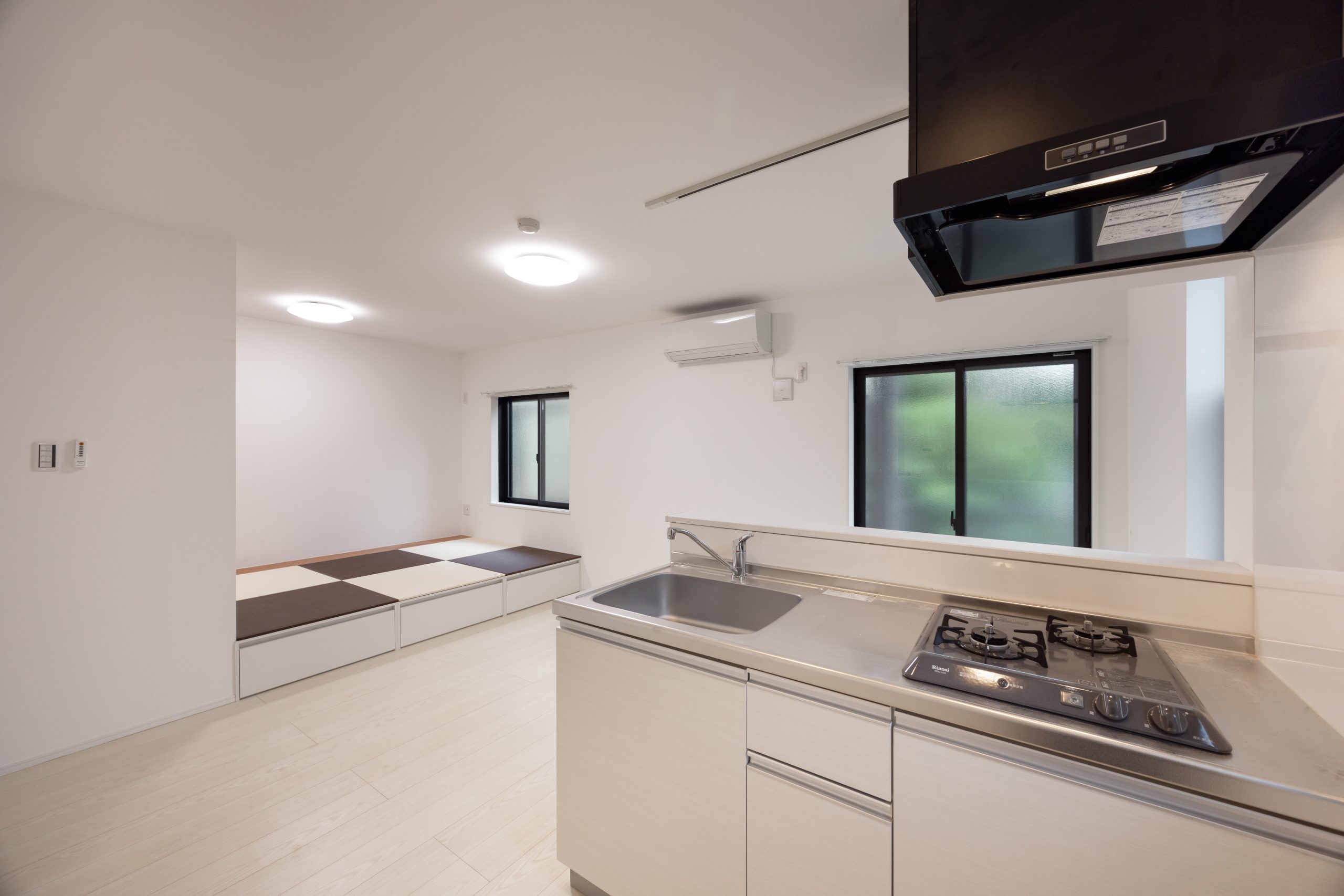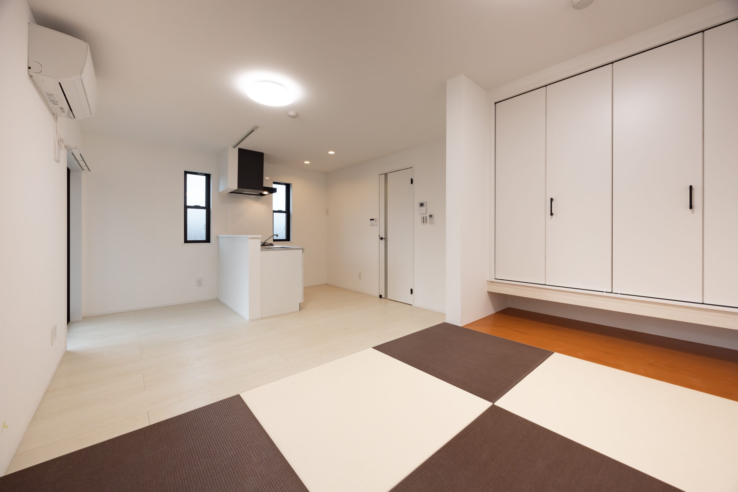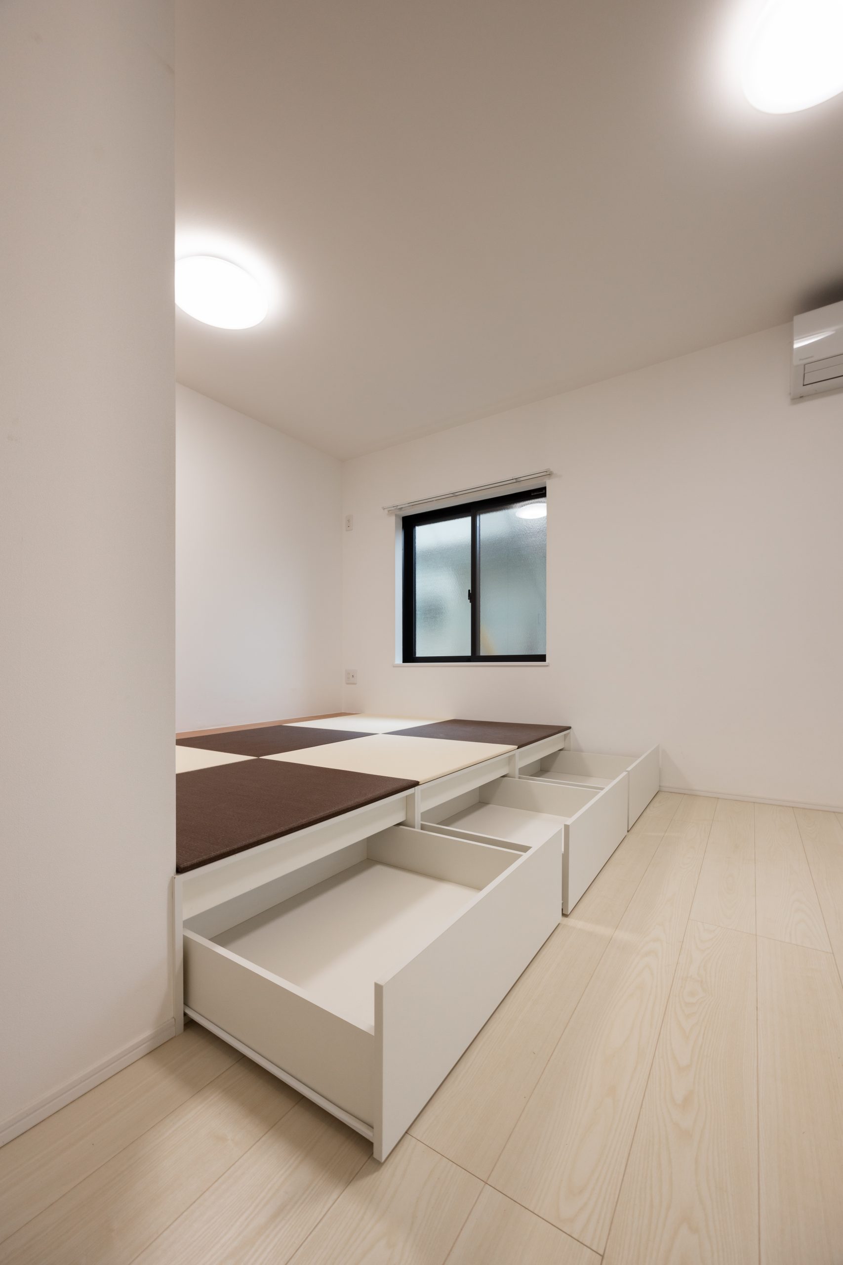 1階の2住戸は、ワンルームに小上がりを設けたプラン。2色の琉球畳を用いた和テイストの空間とし、小上がりの上部・下部を収納として活用することで、限られた専有面積の中でも効率的な空間構成を実現している。収納内部には照明を組み込み、実用性とともに間接照明としての演出効果も加えている点が特徴である。