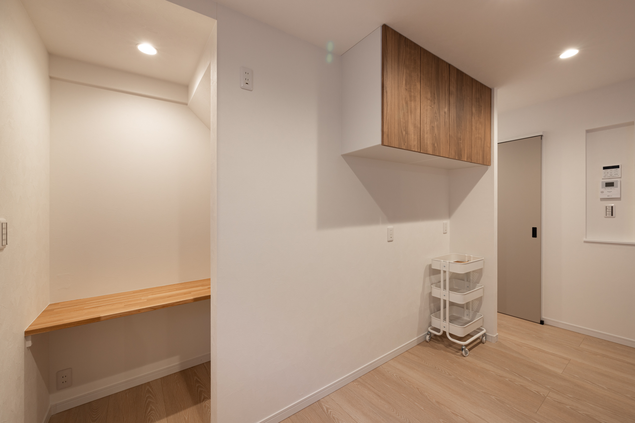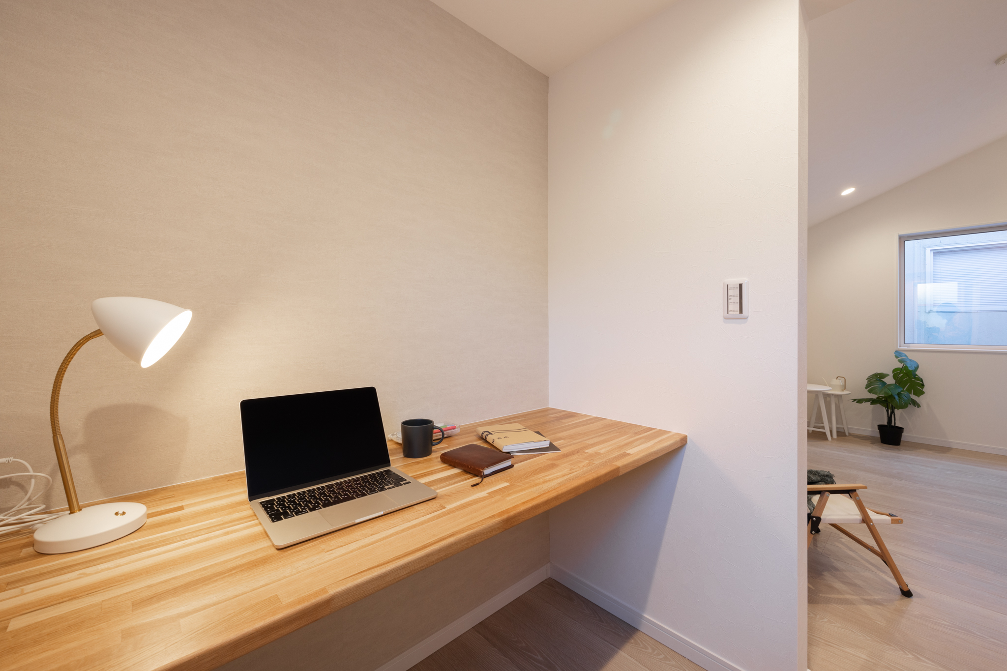 LDKの一角にはカウンター付きの書斎スペースを設けました。個室として閉じるのではなく、家族の気配を感じられる配置とすることで、在宅ワークや学習の場としても無理なく日常に溶け込みます。