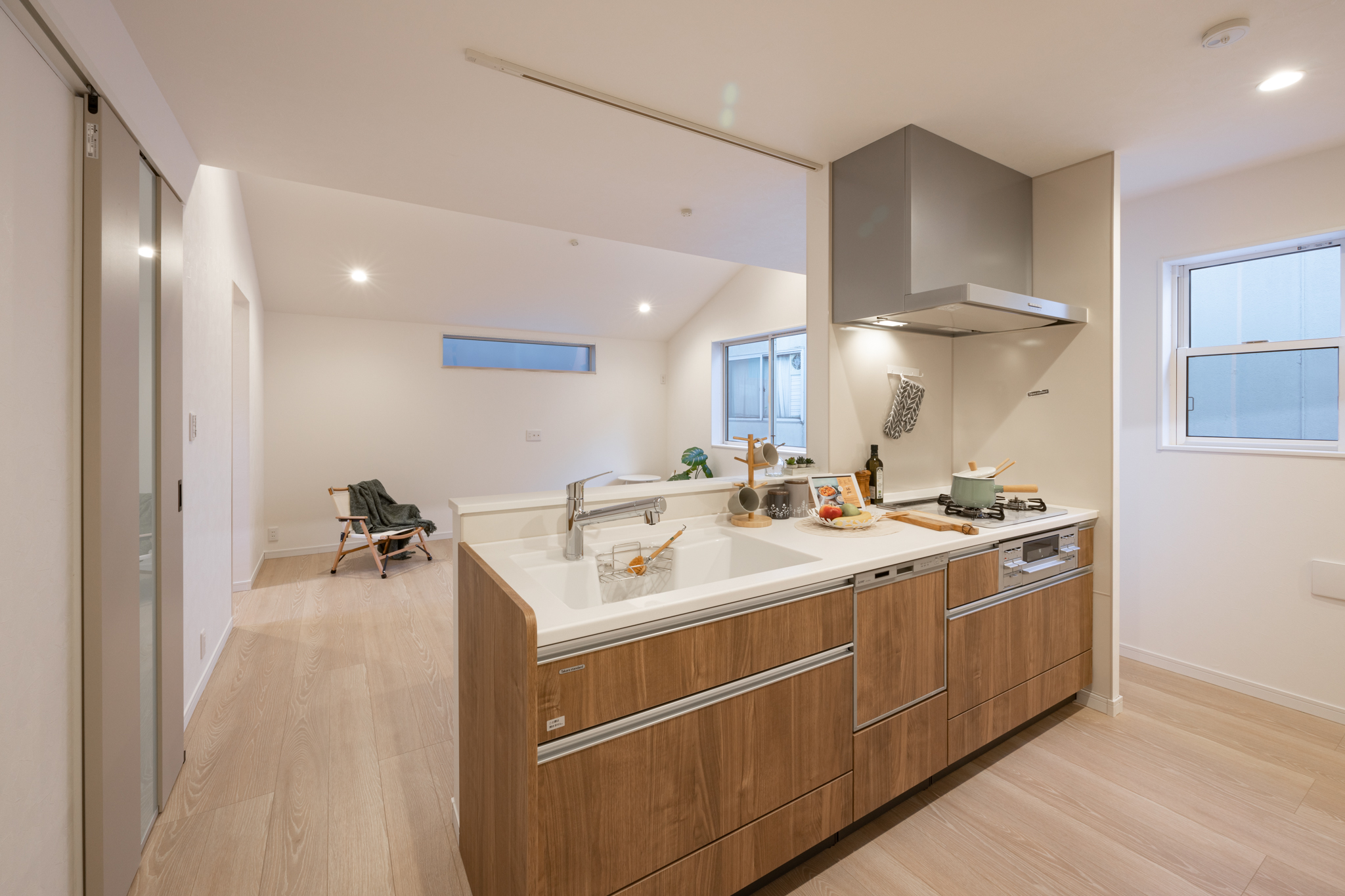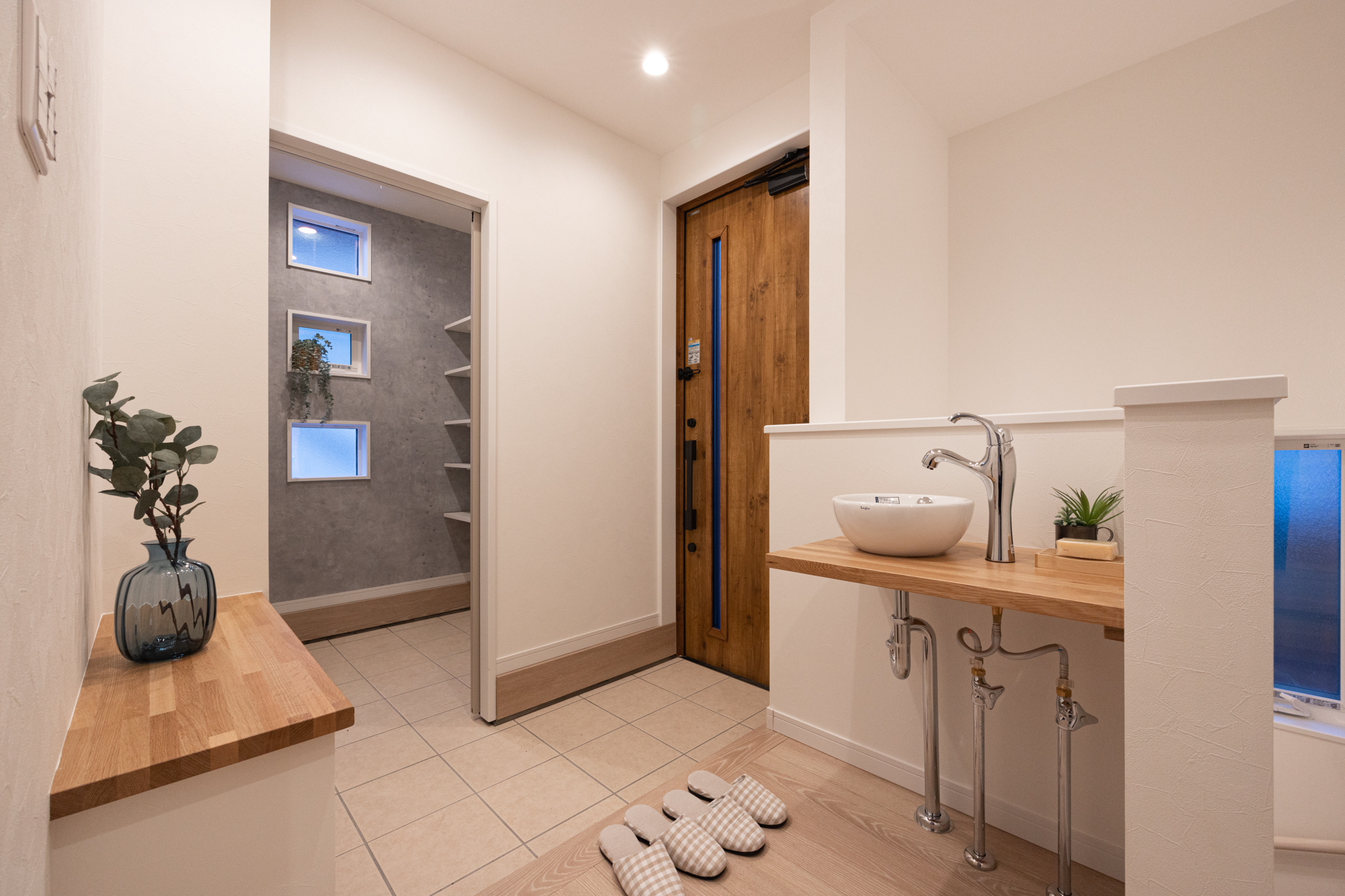 住まいの中心となるLDKにはアイランドキッチンを配置。料理をしながらでも家族と自然に会話が生まれる、開放的な空間構成としました。階段下を活用したパントリーや、玄関に設けた手洗い・ベンチなど、日常の細かな動作まで丁寧に拾い上げた設計も特徴です。