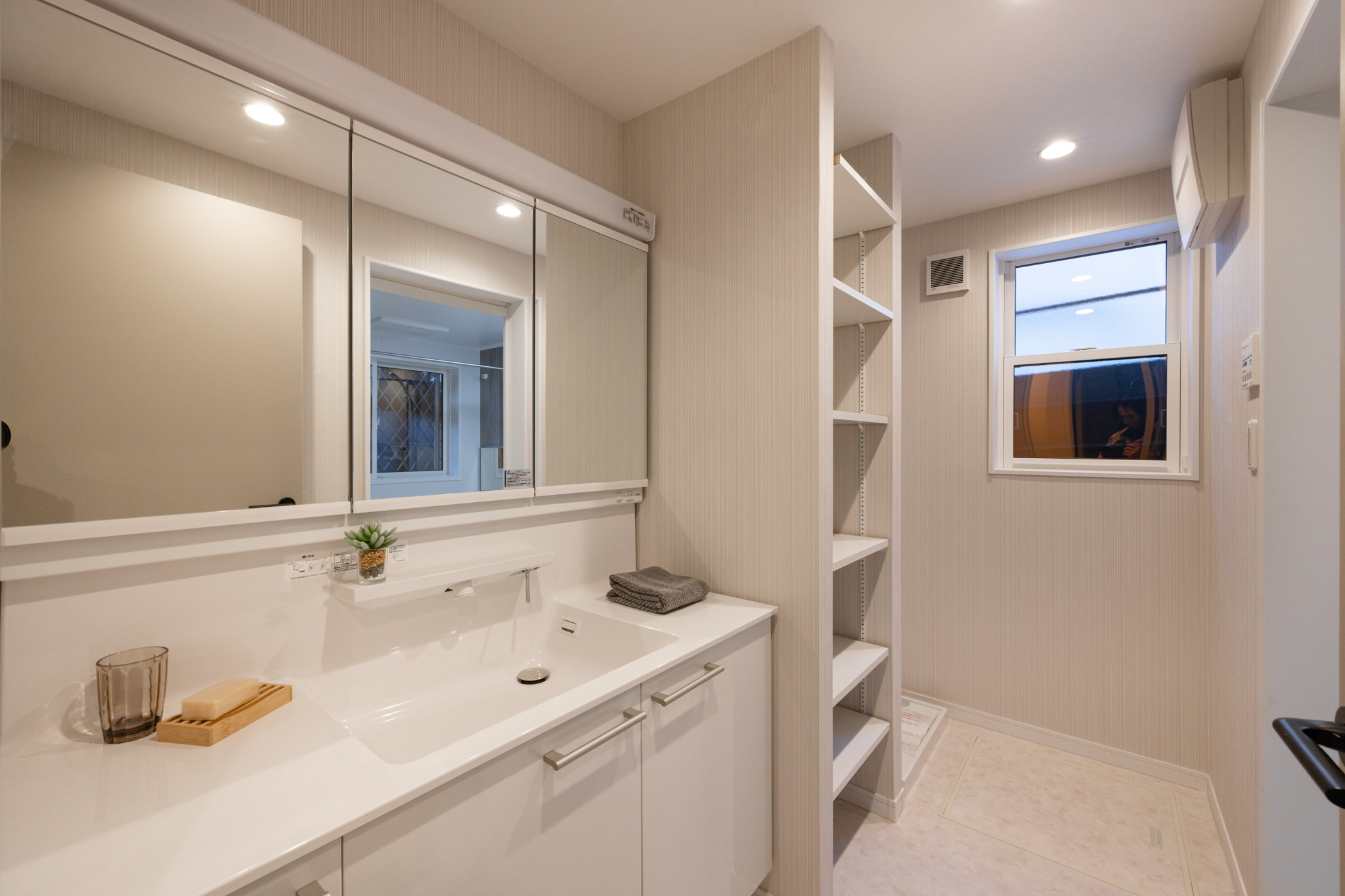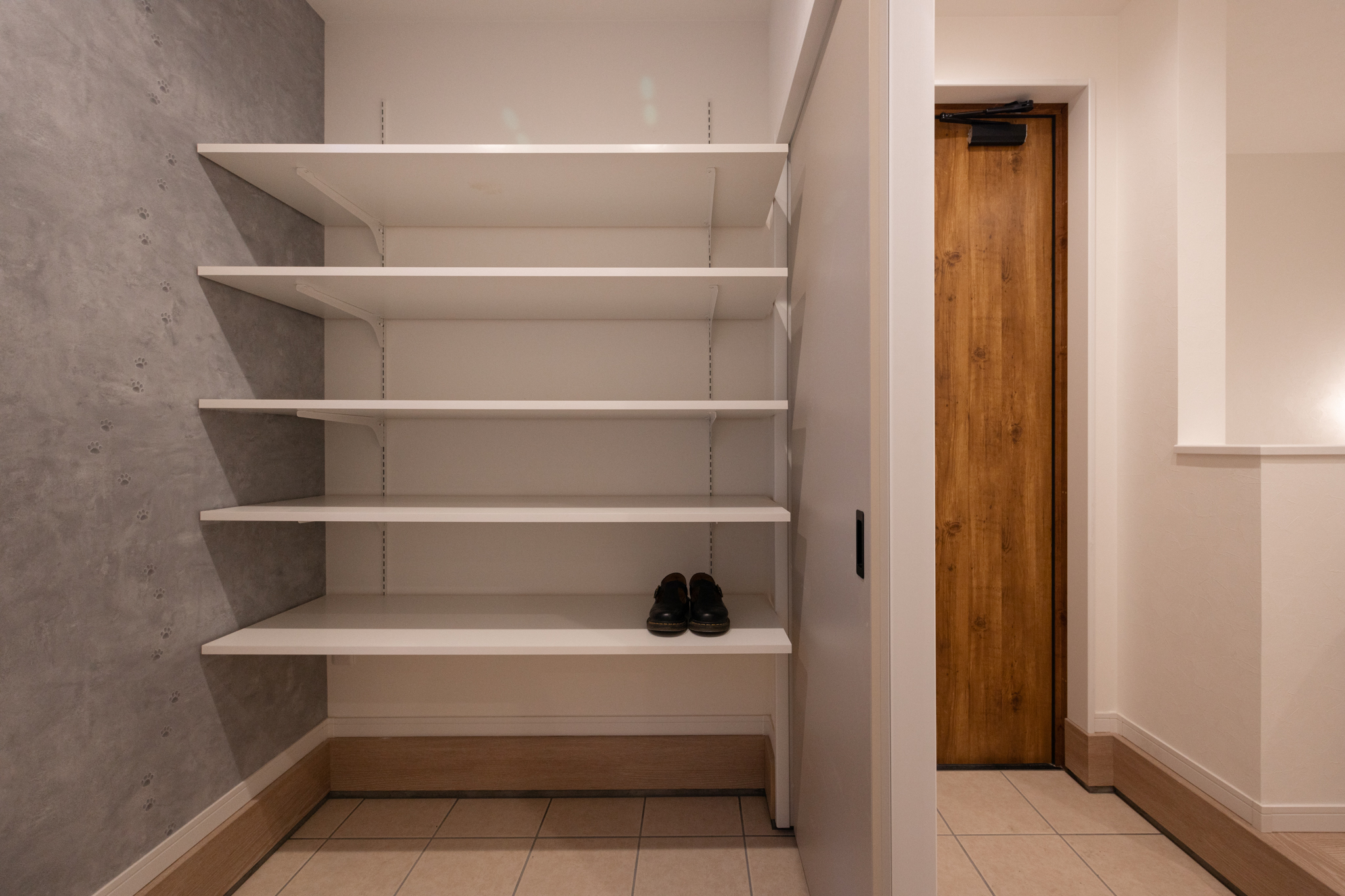 玄関からウォークスルーシューズクローゼットを通り、キッチンやリビングへと抜けられる回遊動線を採用。買い物帰りの動きや家事の移動をスムーズにし、生活効率を高めています。