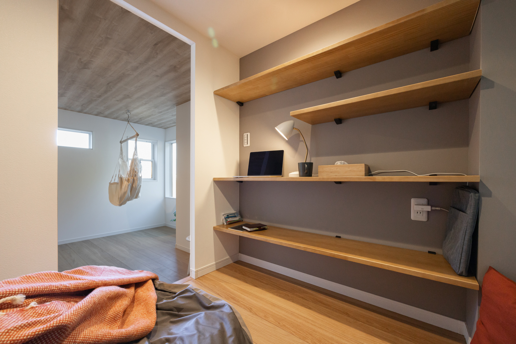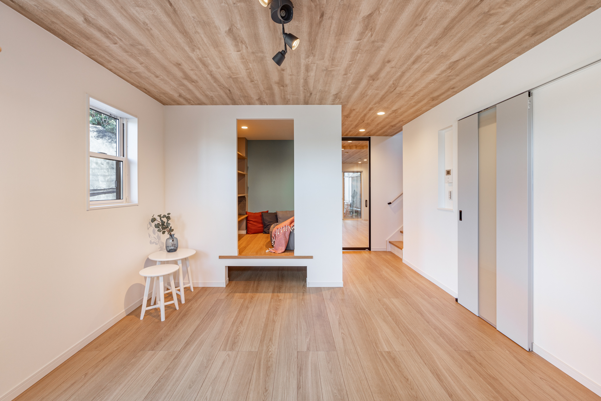 リビングとダイニングキッチンをあえて分けたことで、リビングは単なるくつろぎの空間にとどまりません。スタジオやワークスペースとしても使える、用途を限定しない柔軟な空間に仕上げました。一角にはヌックを設け、読書や集中したい時間を過ごせる“こもり感”のある場所も確保しています。