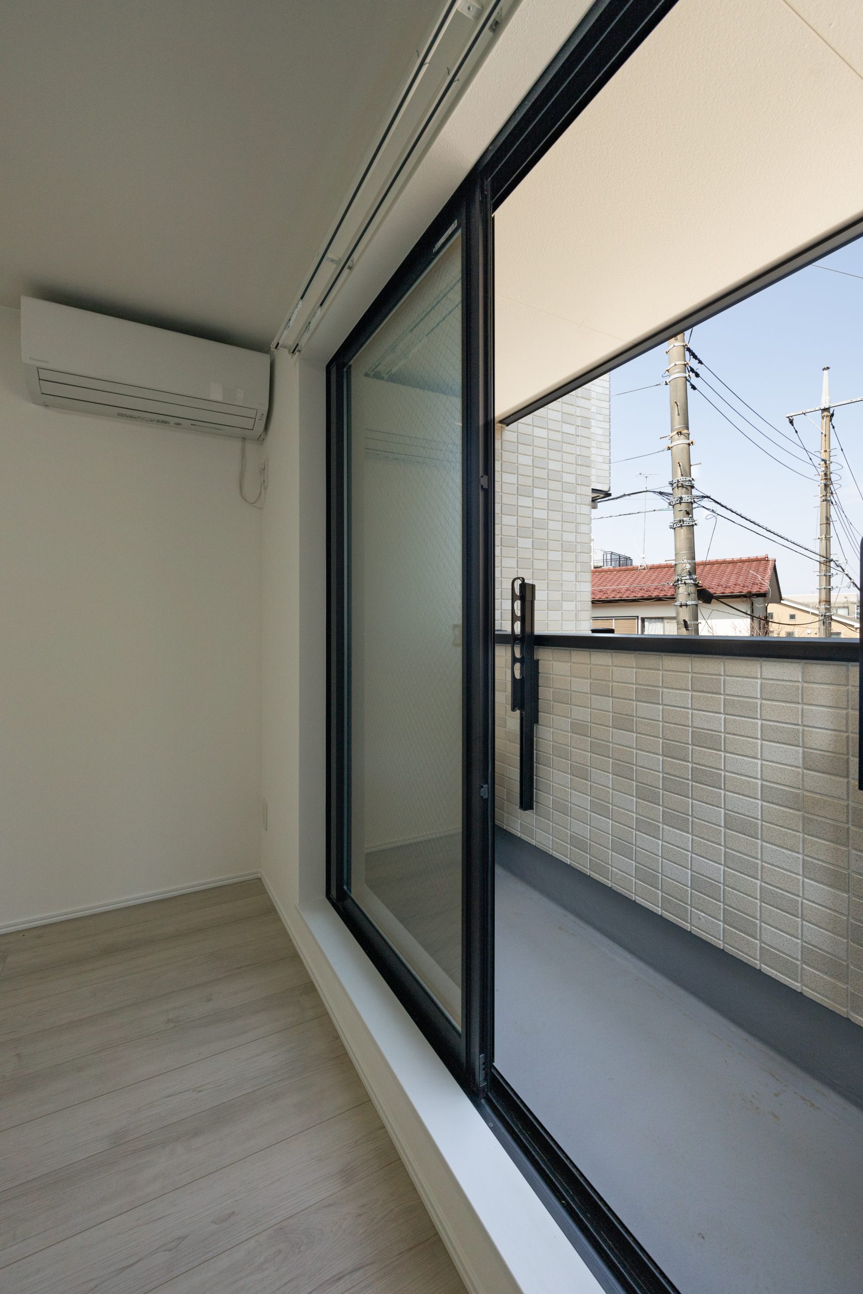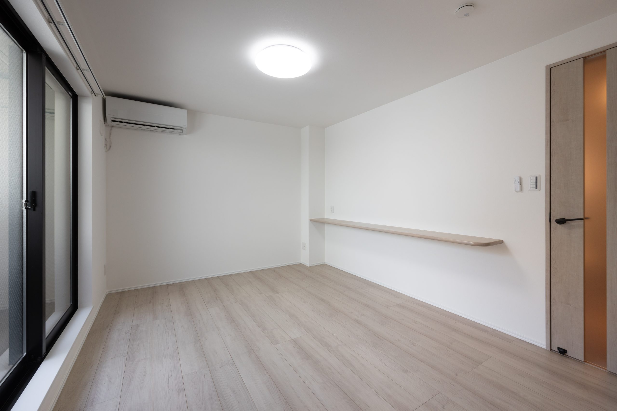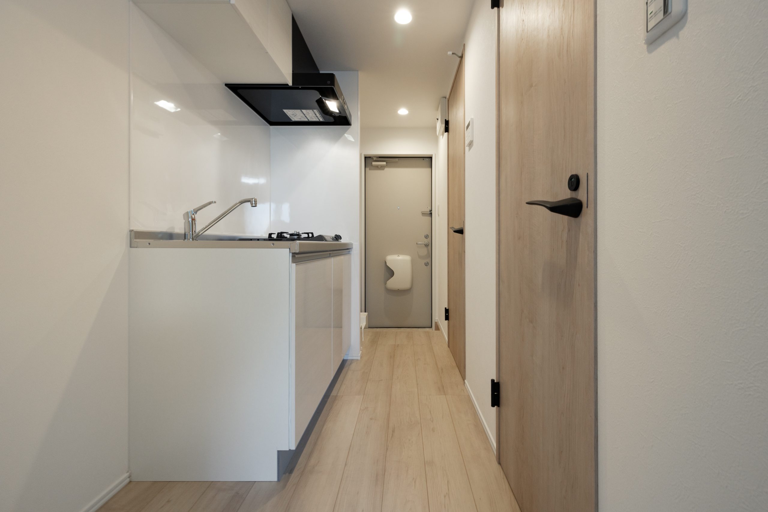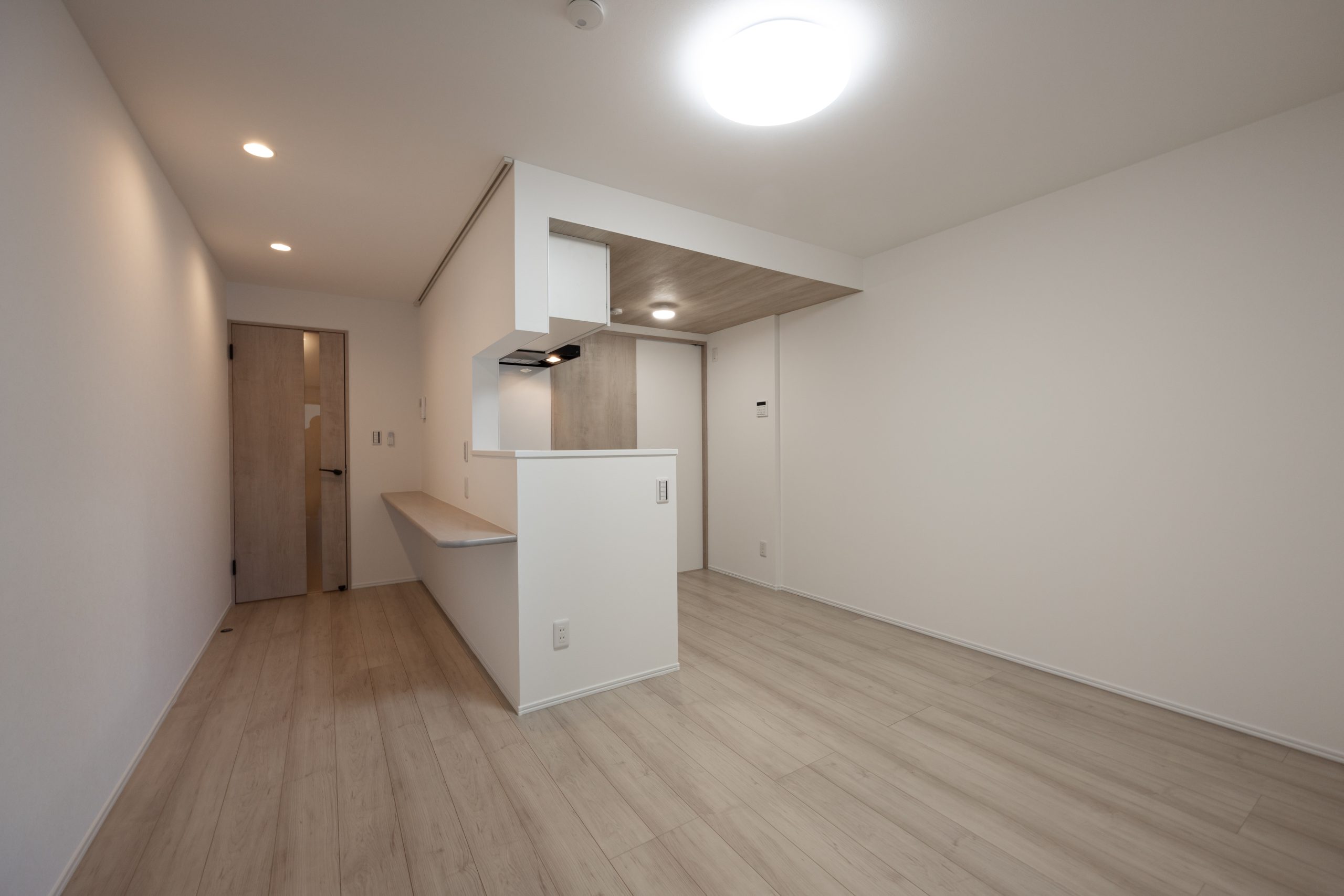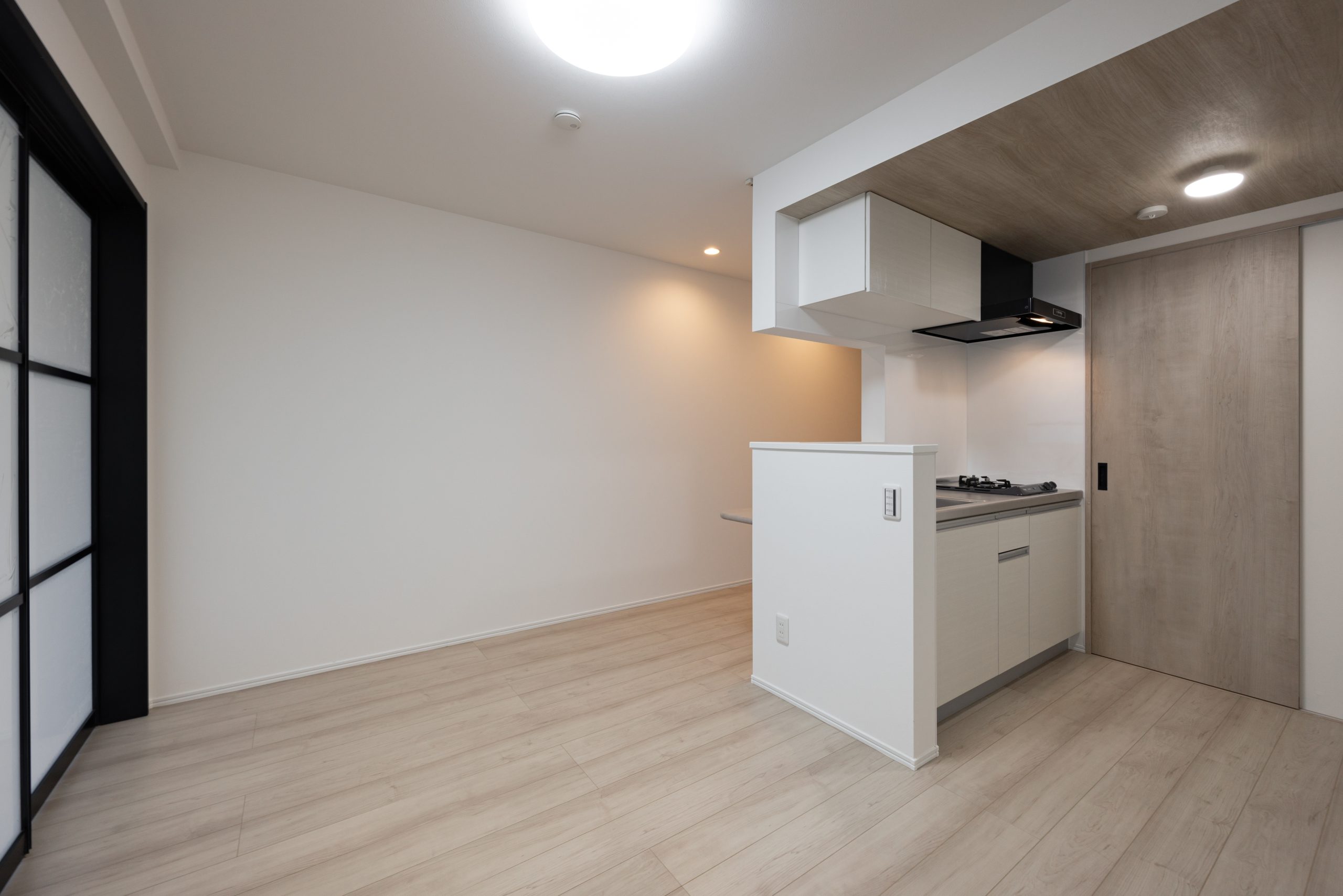 1LDK住戸にはカウンターキッチンを採用し、調理と生活空間がゆるやかにつながる設えに。居室との境には採光性のある建具を用いることで、視線と光を遮りすぎず、空間の広がりと明るさを確保しました。