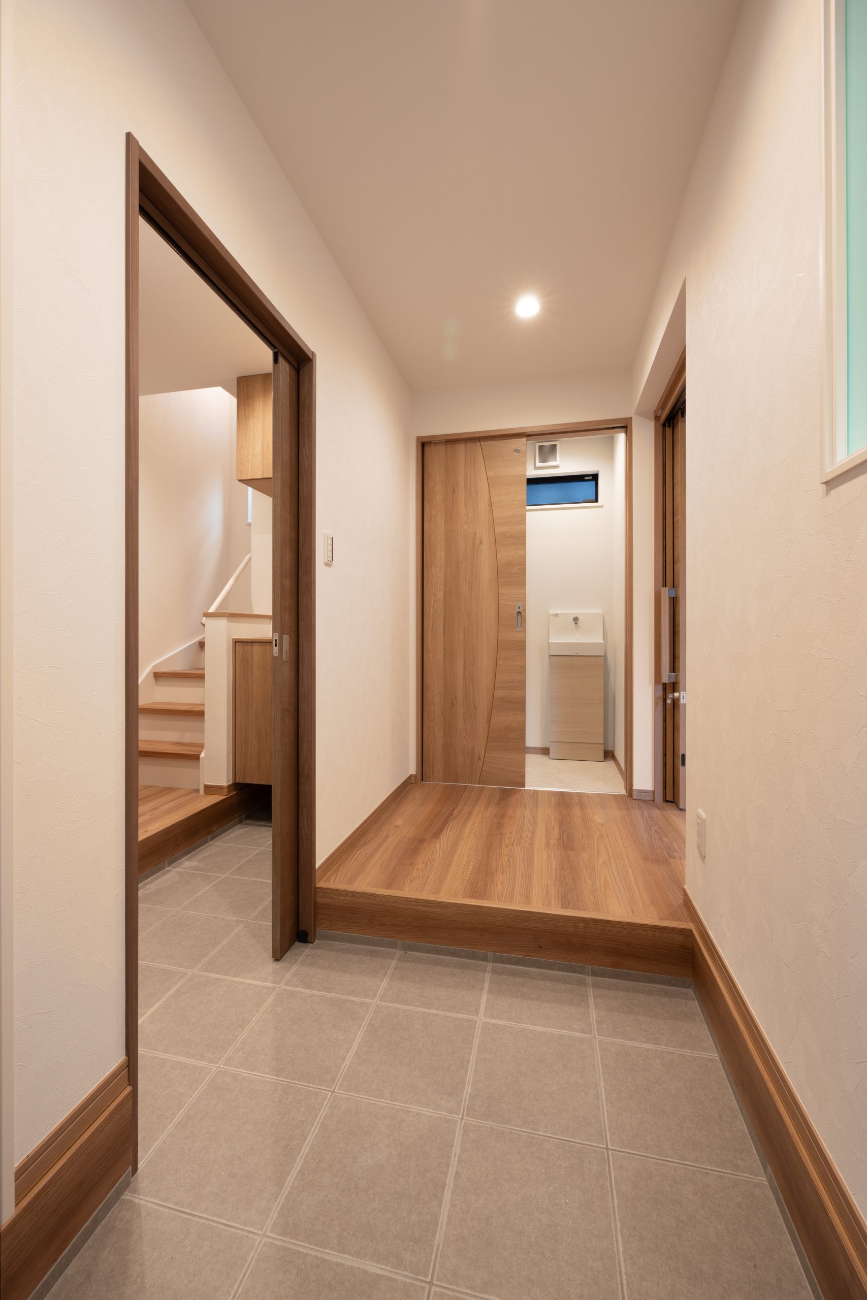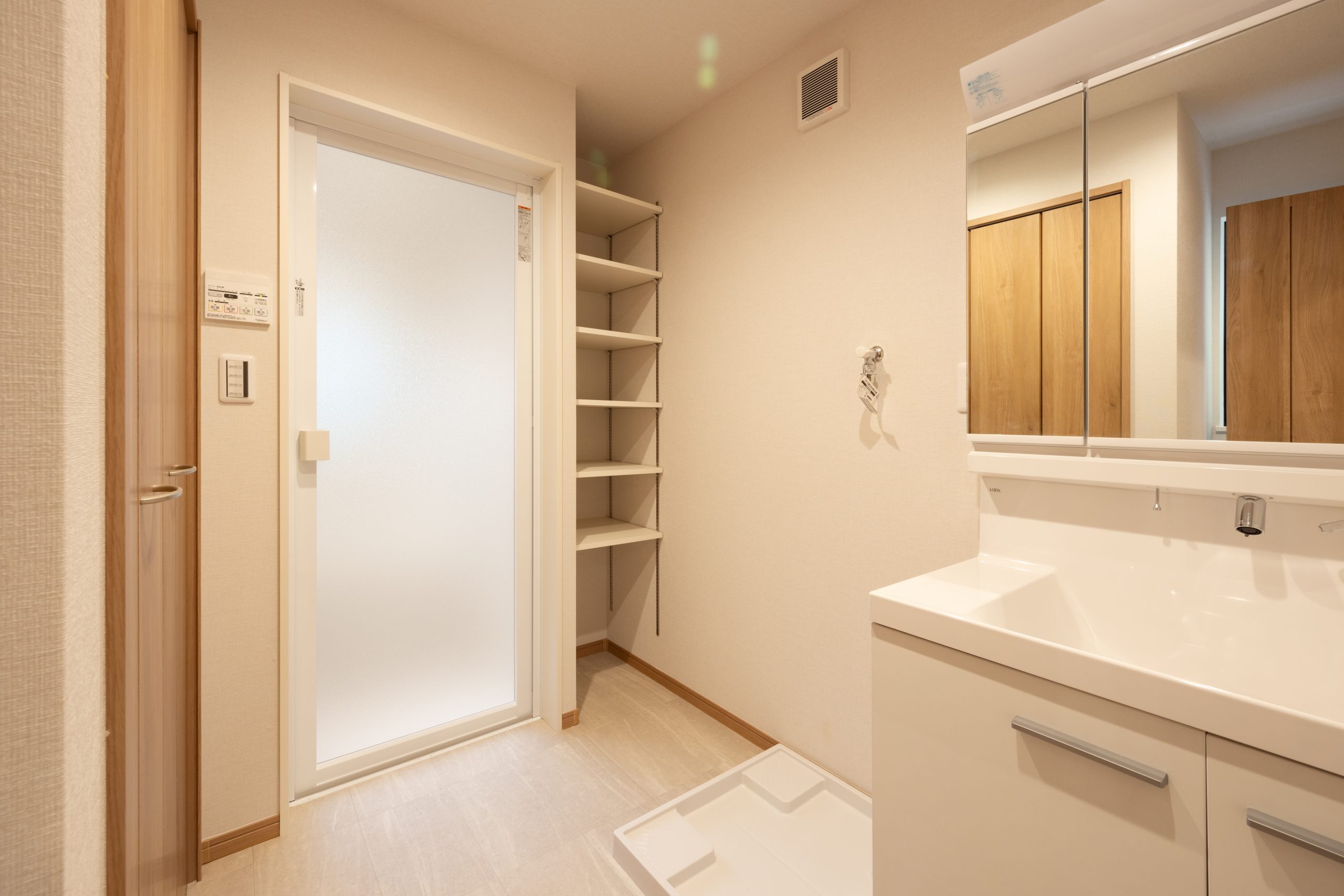 収納計画も、併用住宅ならではの視点で丁寧に整えている。LDKには十分な収納を設け、洗面脱衣所には可動棚を二箇所配置。日用品だけでなく、整骨院で使用するタオルなどの備品も用途ごとに整理できる構成とした。