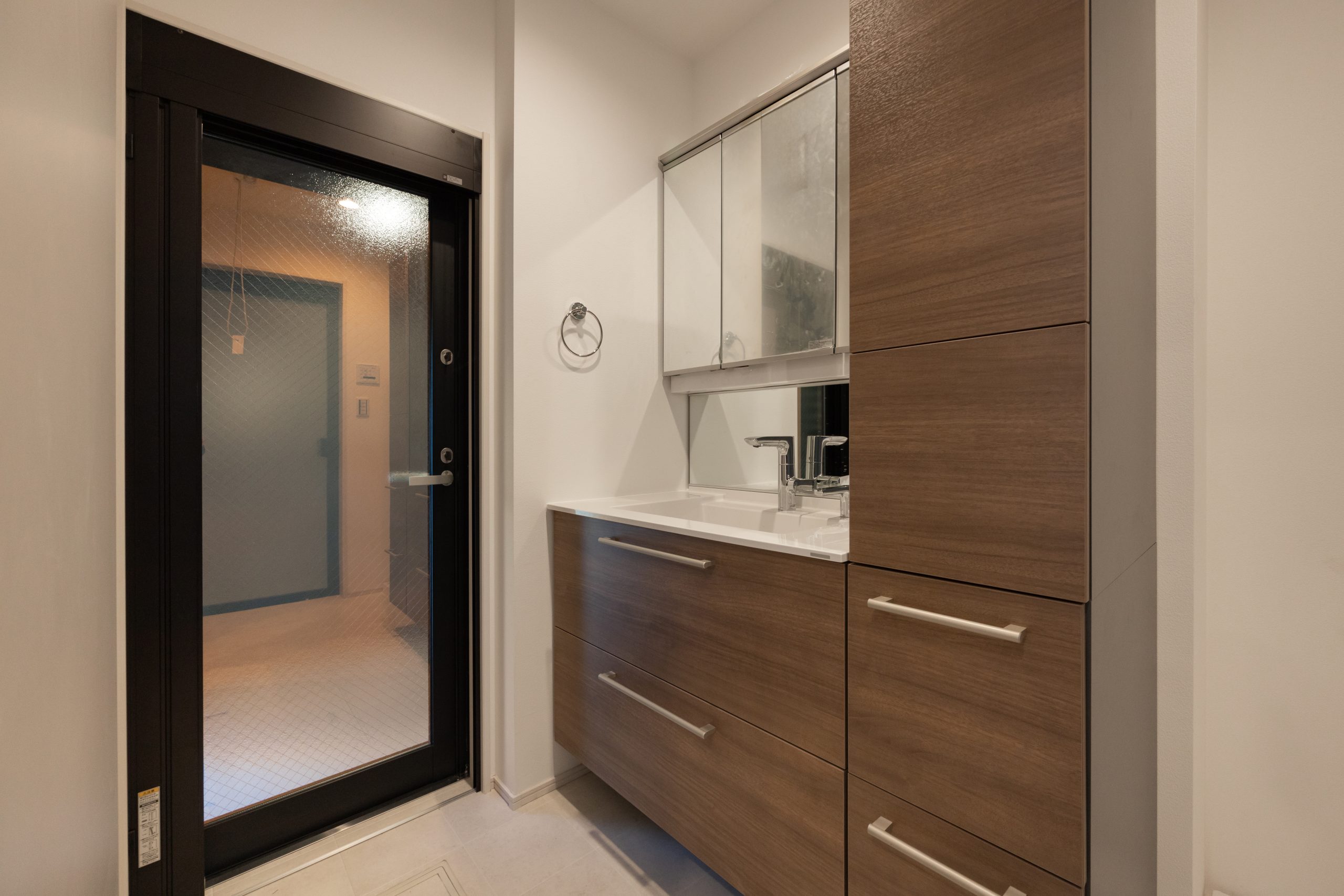 最大の特徴は、ビルトインガレージから洗面所・浴室へと直接つながる帰宅動線だ。海やアウトドアから戻った際も、砂や濡れた道具を室内へ持ち込まずに水回りへアクセスできる。鎌倉という環境に合わせて、暮らし方そのものを設計に落とし込んだ構成である。