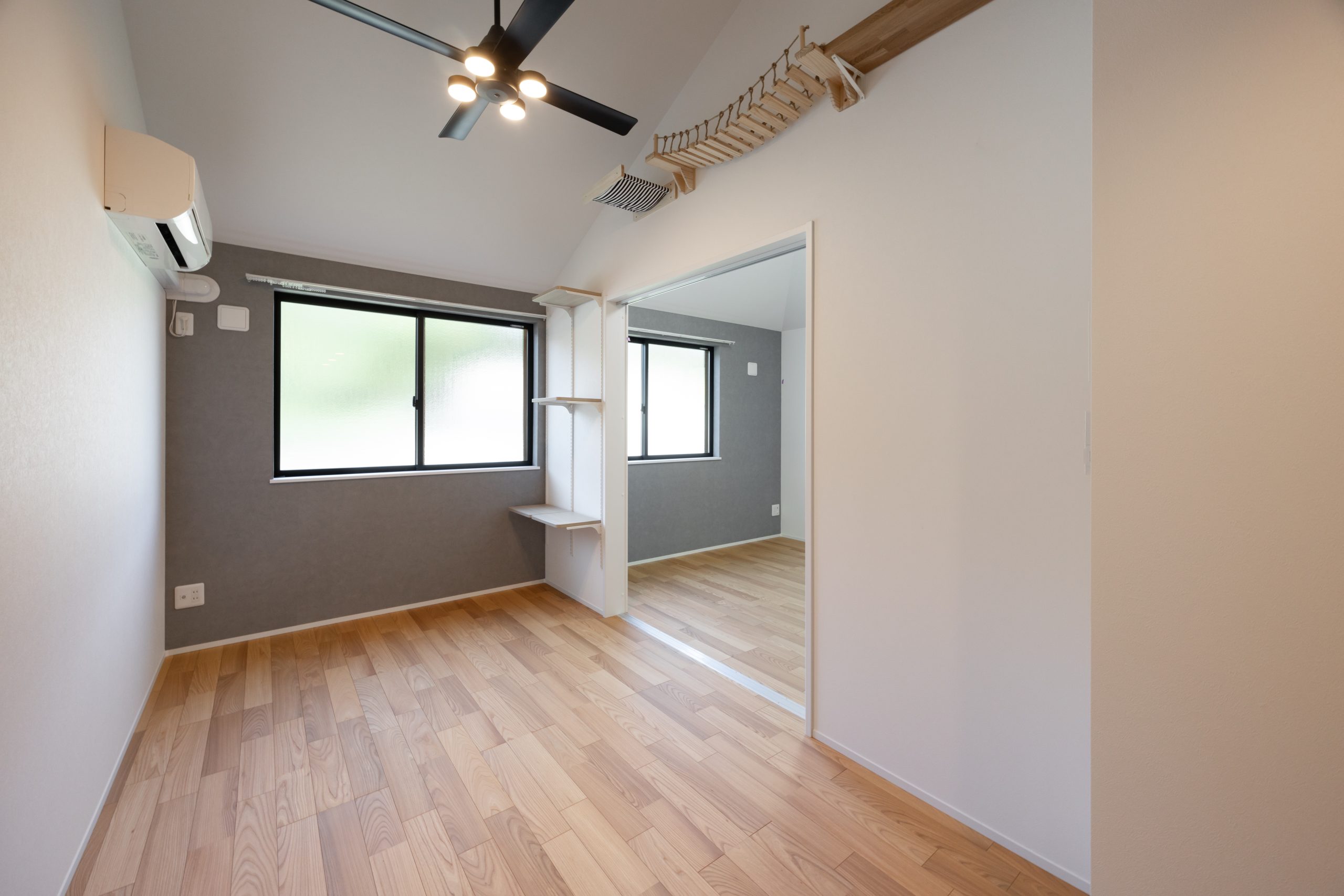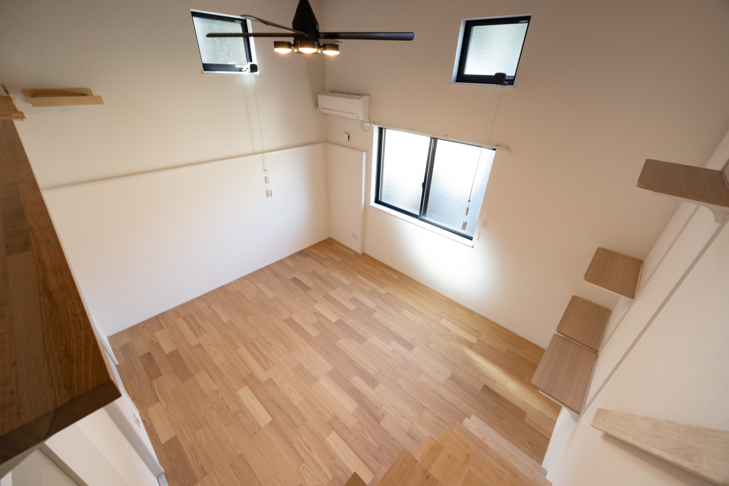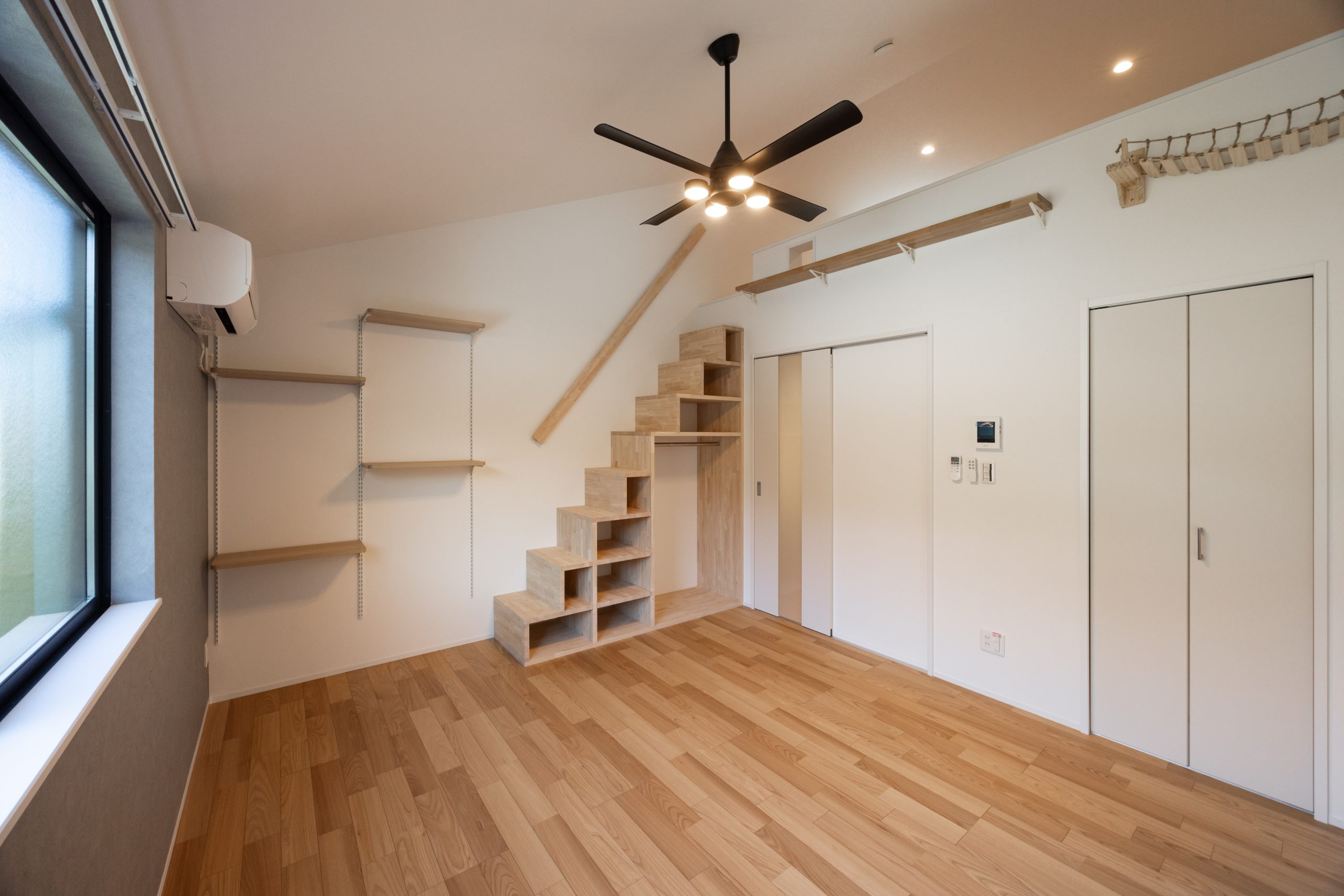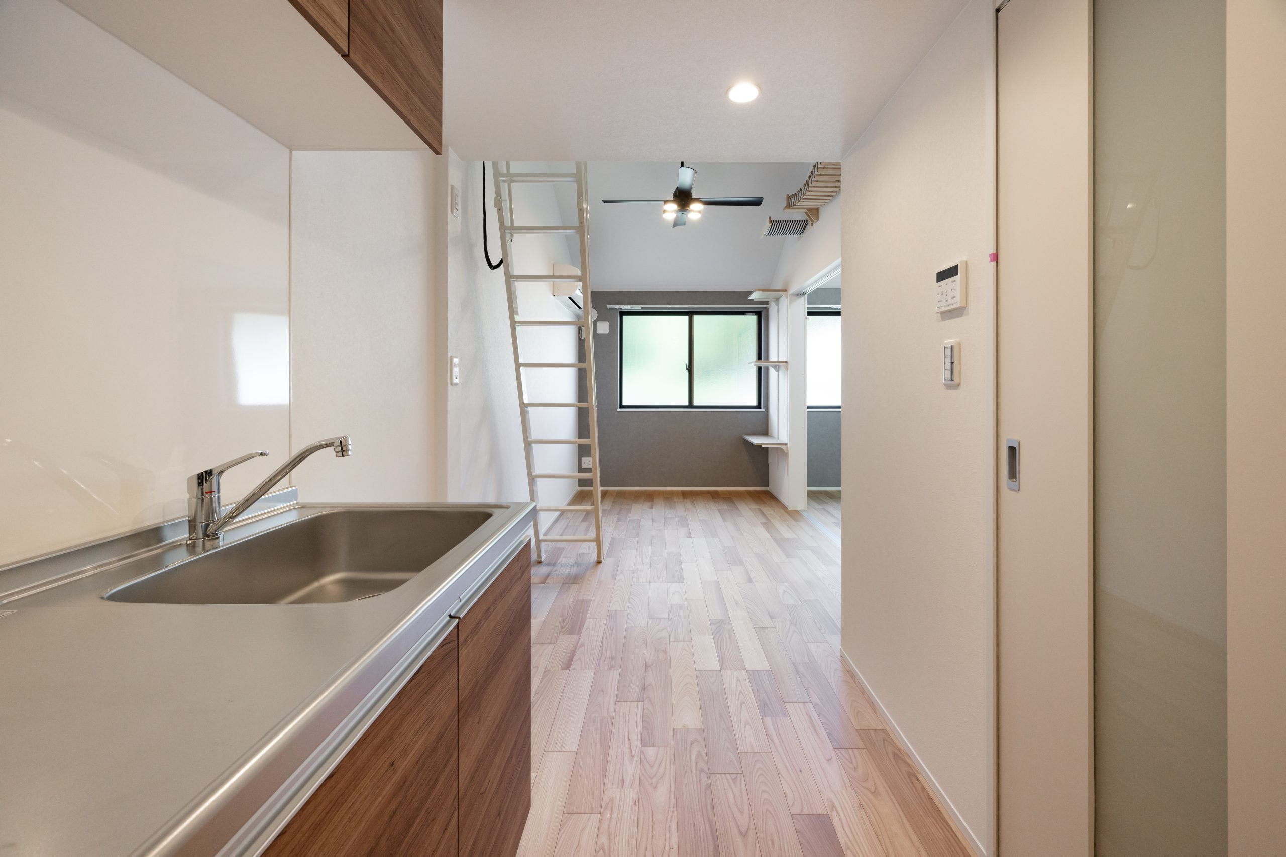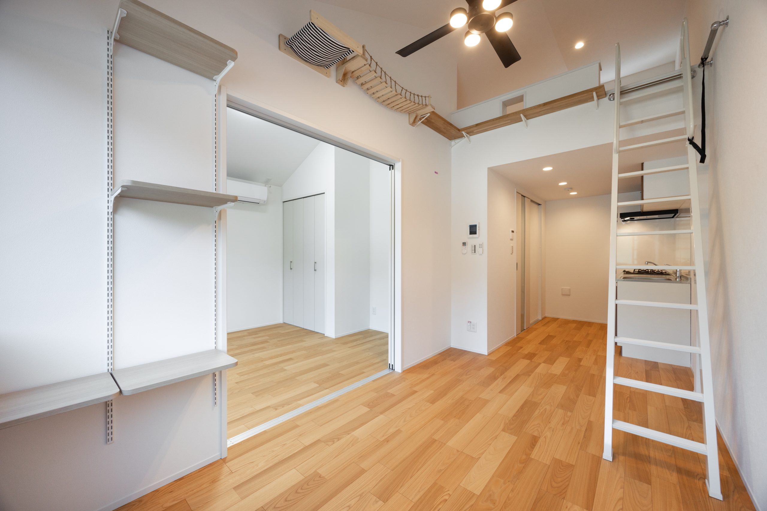 本物件では、単なる「ペット可」ではなく、ねこが室内を立体的に使うことを前提に空間を組み立てた。各住戸にはキャットウォークやステップを設置し、上下運動を促す動線を確保。限られた専有面積の中でも、ねこがストレスなく動き回れる環境を整えている。