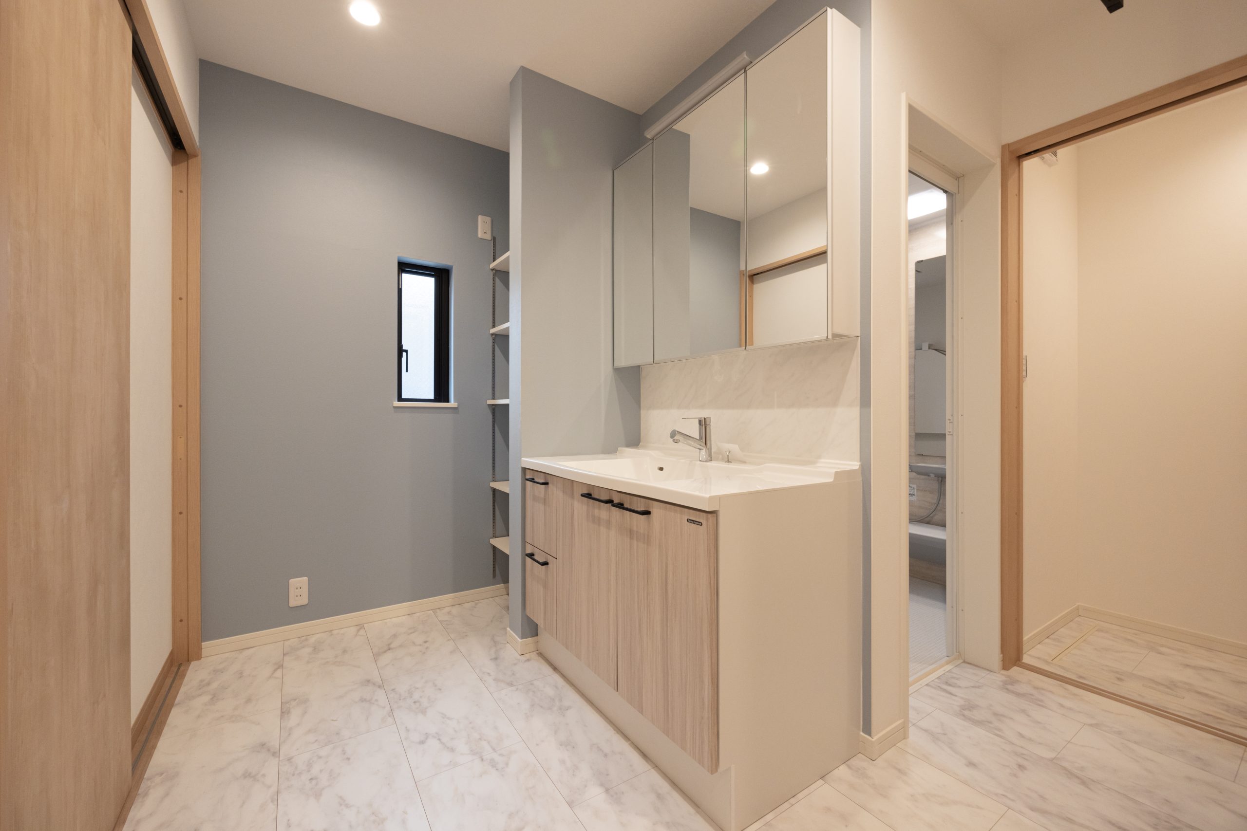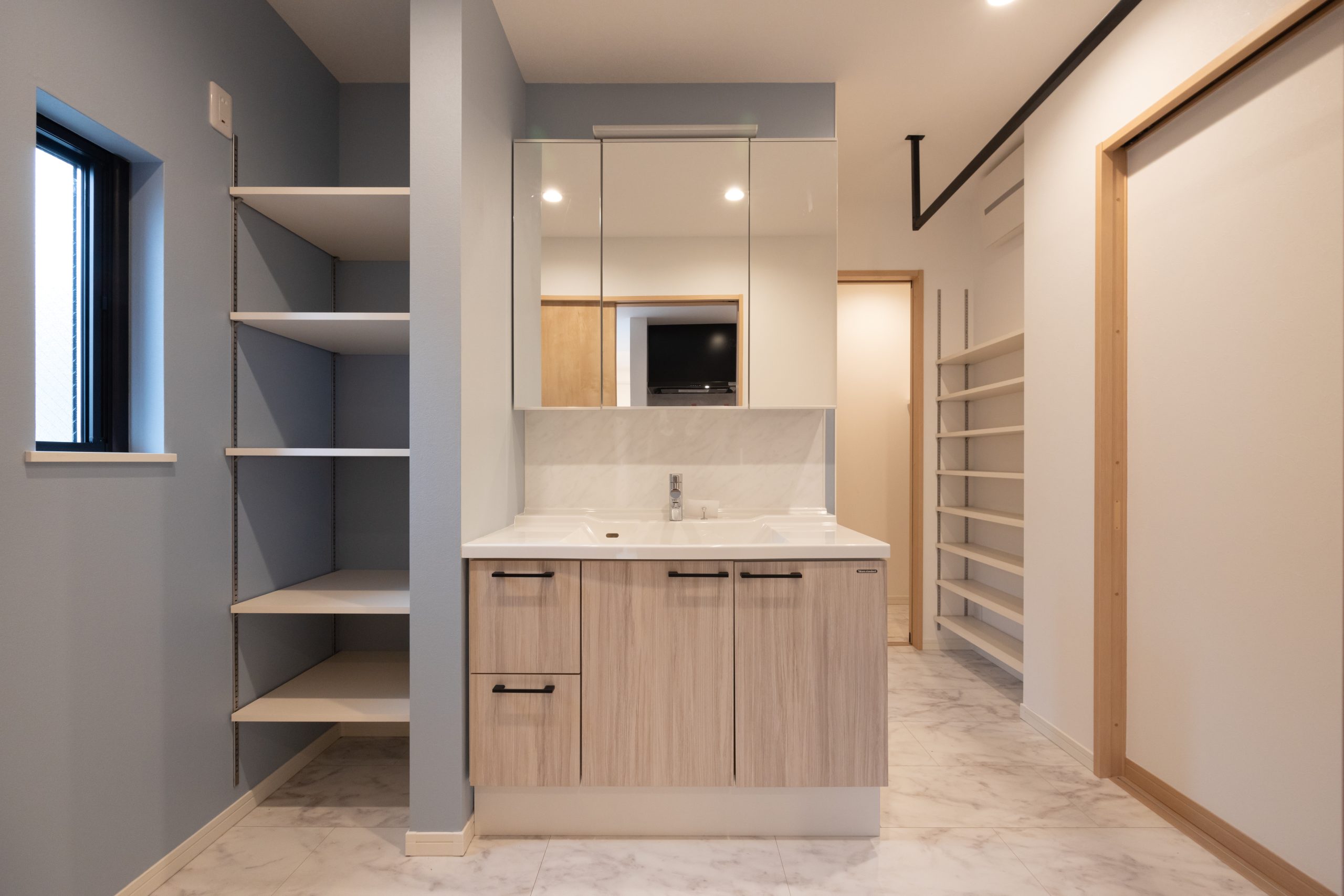 洗面脱衣所兼ランドリールームには可動棚を二か所設け、室内干し設備も備えている。洗う・干す・しまうという一連の動きを一か所に集約することで、家事が分断されないスムーズな流れを実現した。