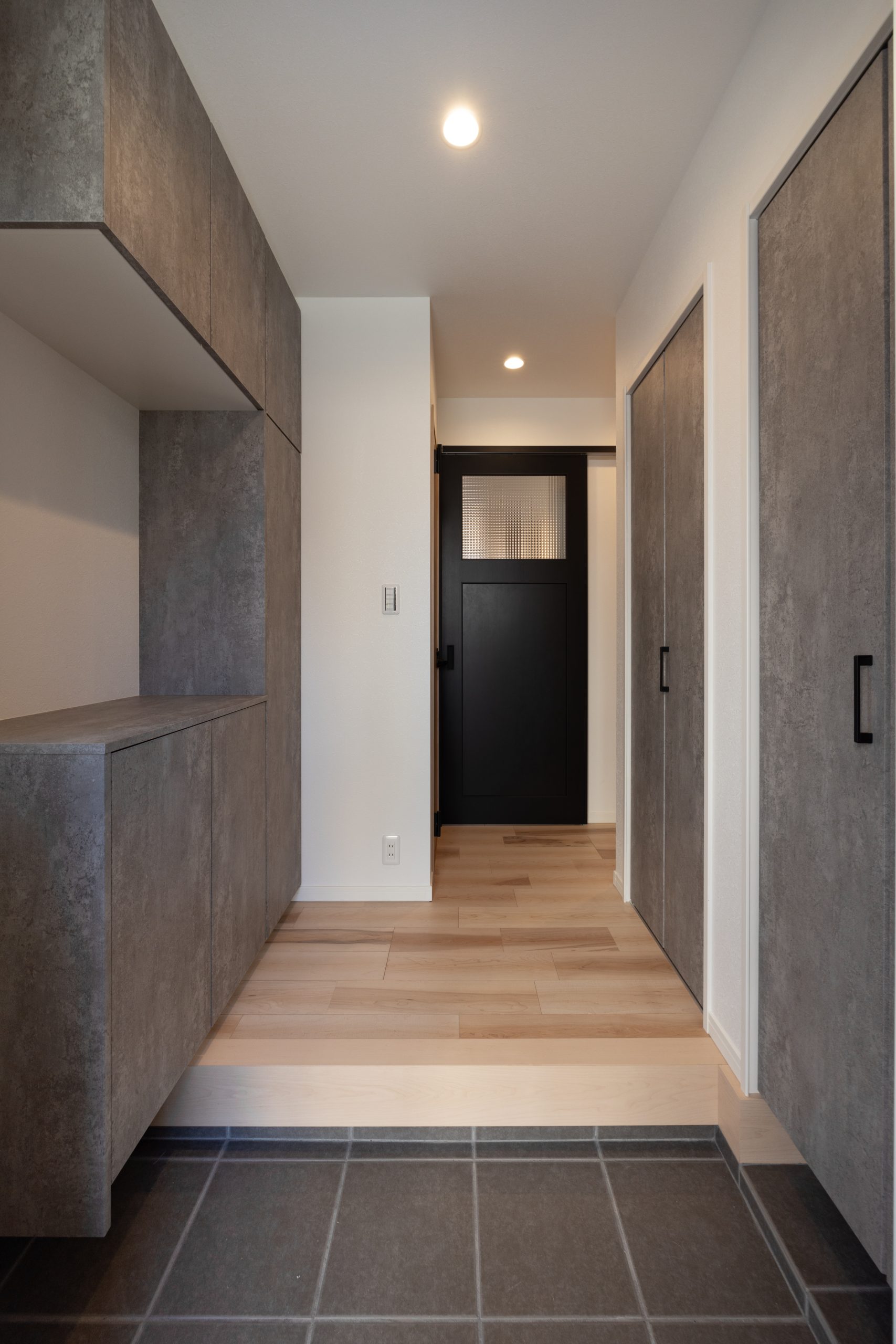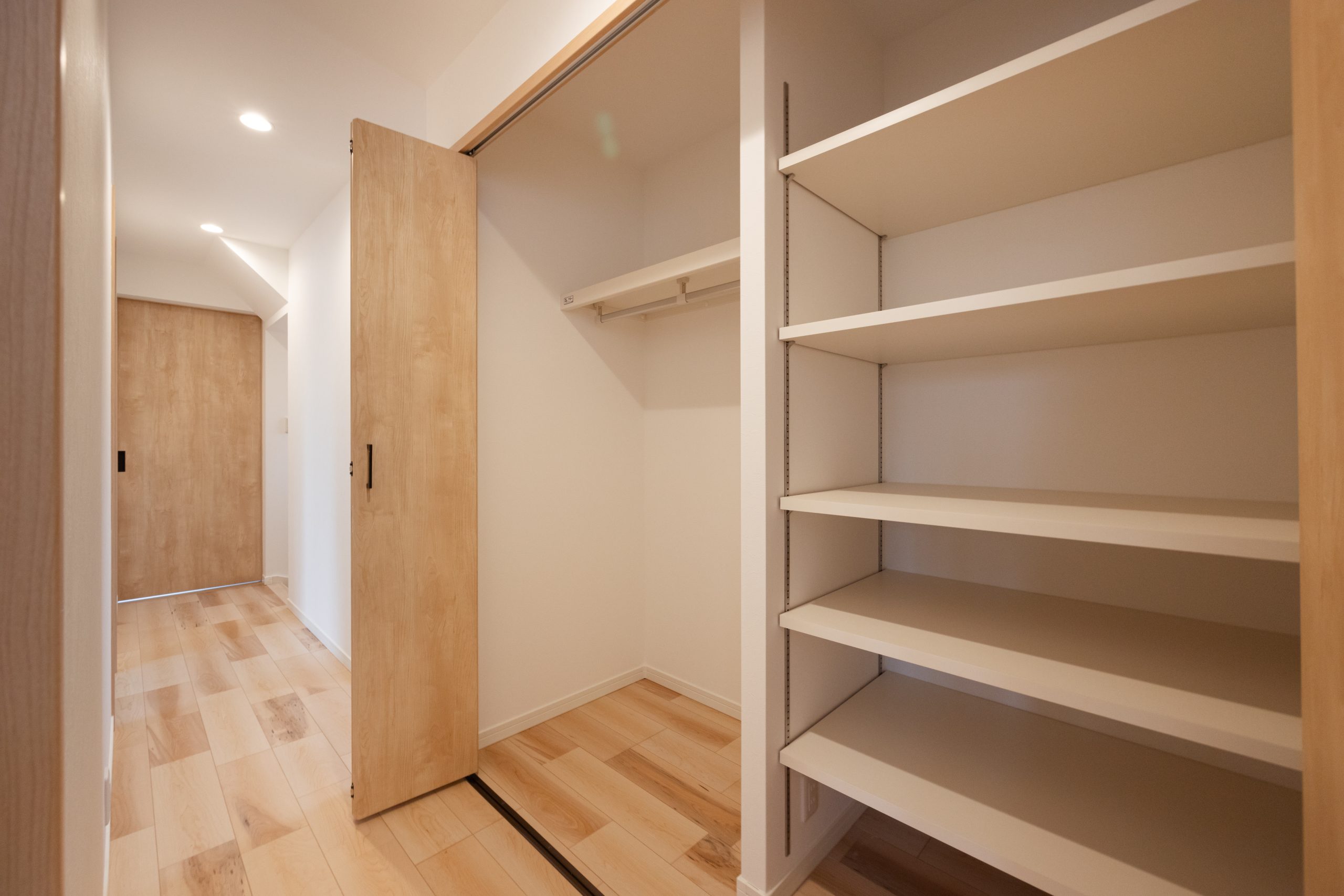 収納計画も動線と一体で整えている。寝室へ続く廊下にはファミリークローゼットとして活用できる大型収納を設置。玄関にはアウトドア用品やスポーツ用品を収められるスペースを確保し、室内に生活感を持ち込みにくい構成とした。