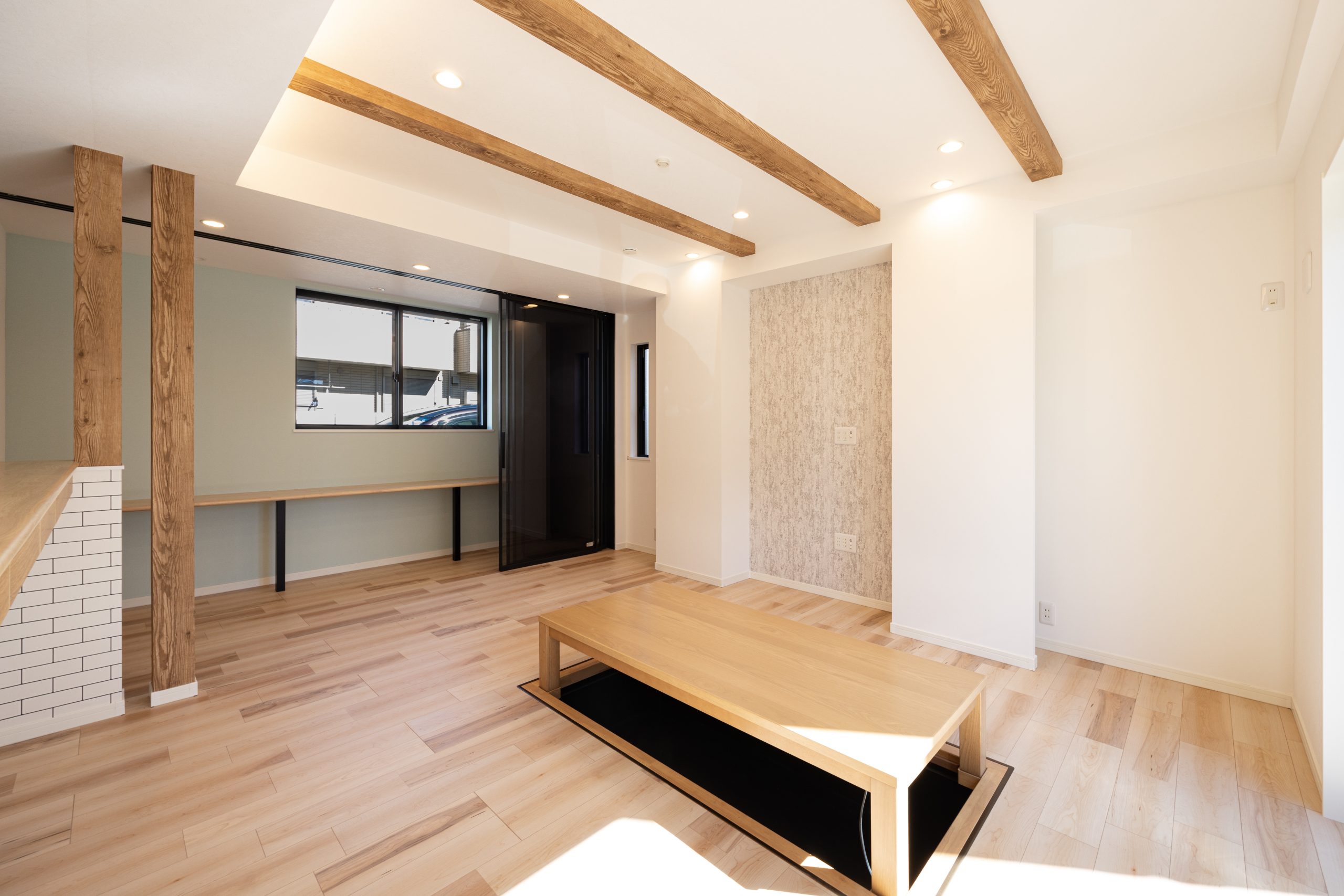リビングには掘りごたつを設け、床に近い目線でくつろげる居場所を用意した。包み込まれるような安心感があり、家族や来客が思い思いに過ごせる場となっている。LDKの一角には程よい距離感のワークスペースを設置。リモートワークや子どもの学習にも対応しつつ、完全に閉じないことで家族の気配を感じられる配置とした。