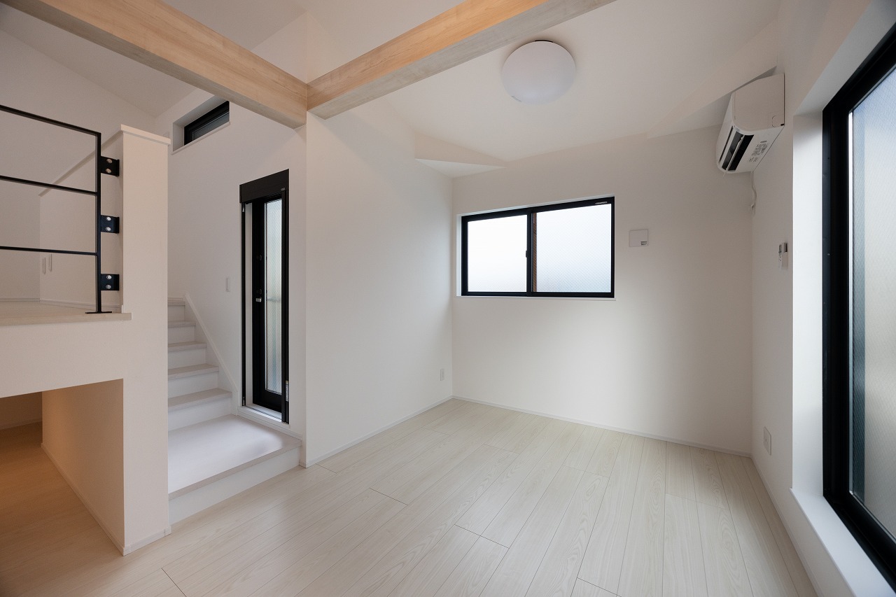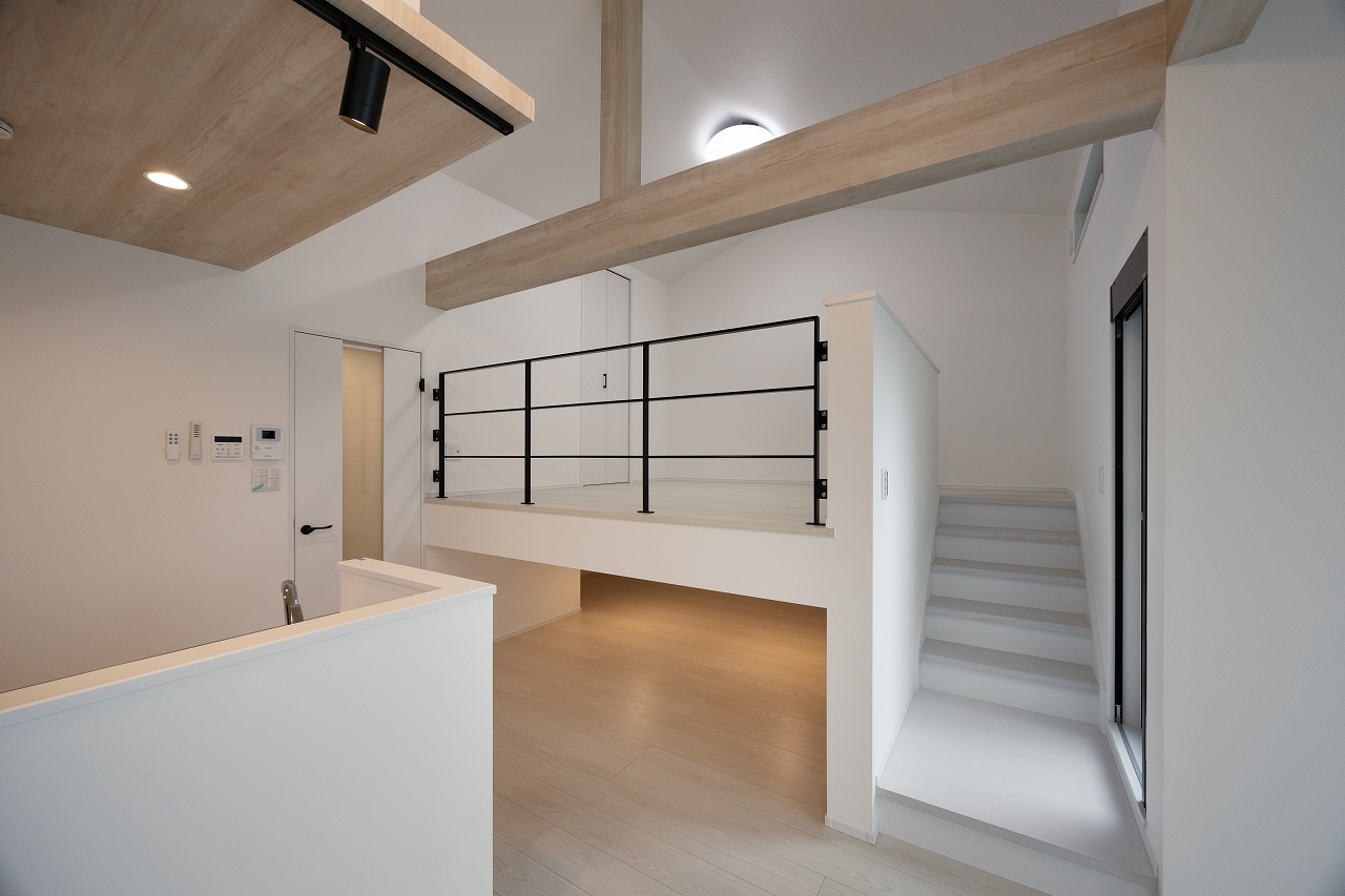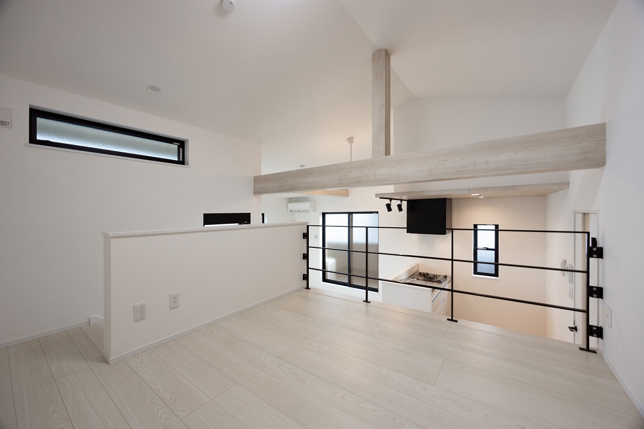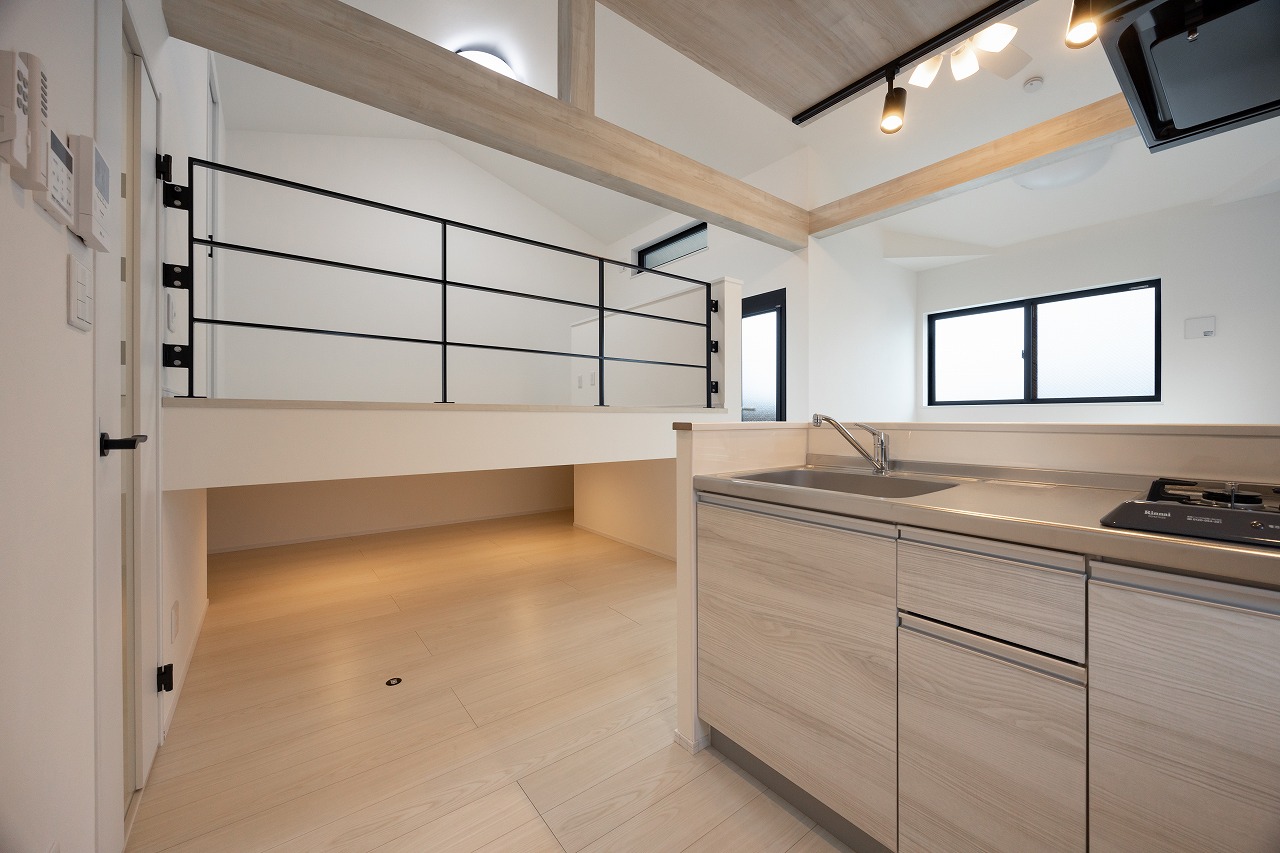 1LDK住戸ではスキップフロアやロフトを採用し、天井高を活かした立体的な空間を形成。床面積以上の広がりを感じさせると同時に、蔵収納やウォークインクローゼットを設けることで十分な収納力も確保している。空間を縦方向に活用することで、暮らしに自然な余白が生まれている。