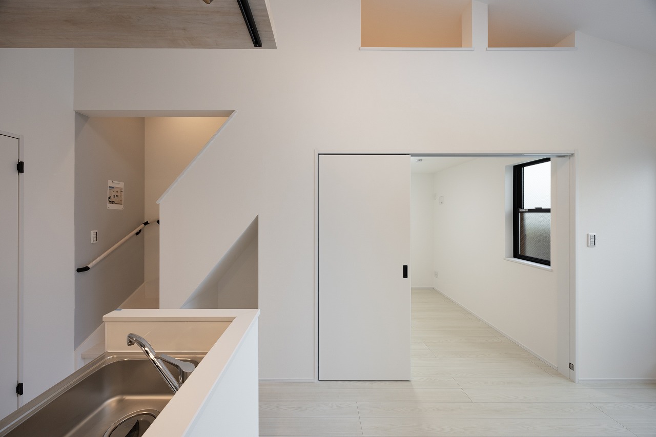 キッチンは対面式を採用し、冷蔵庫や食器棚の配置まで想定した設計とした。実際の生活動線を具体的に描くことで、使い勝手に無理のない住戸に仕上げている。