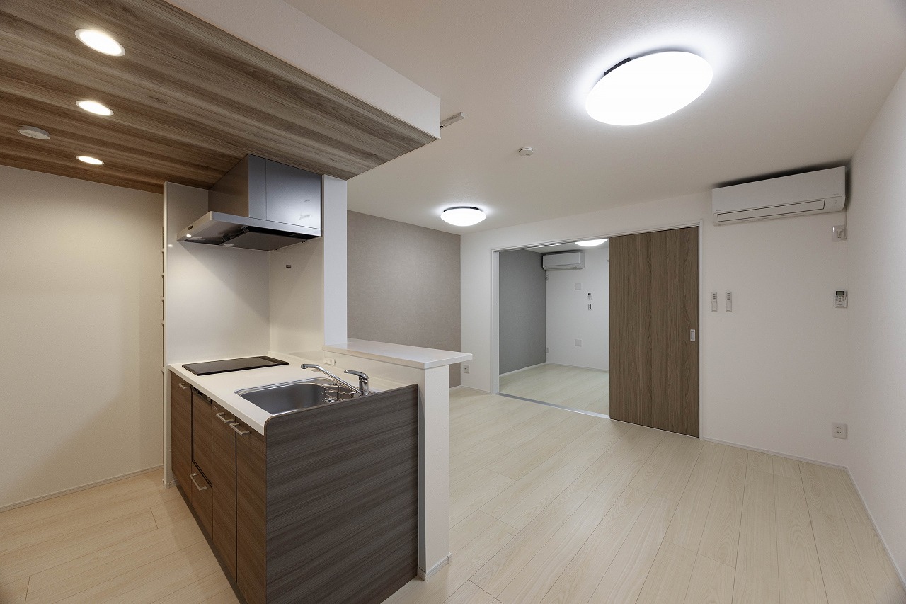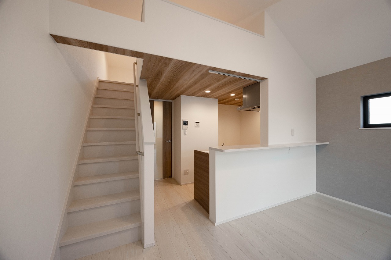 LDKには対面式のカウンターキッチンを採用。背面には可動棚収納を設け、調理・配膳・片付けまでの動線を整理している。日々の使い勝手を具体的に想定することで、入居後の生活イメージが描きやすい空間とした。