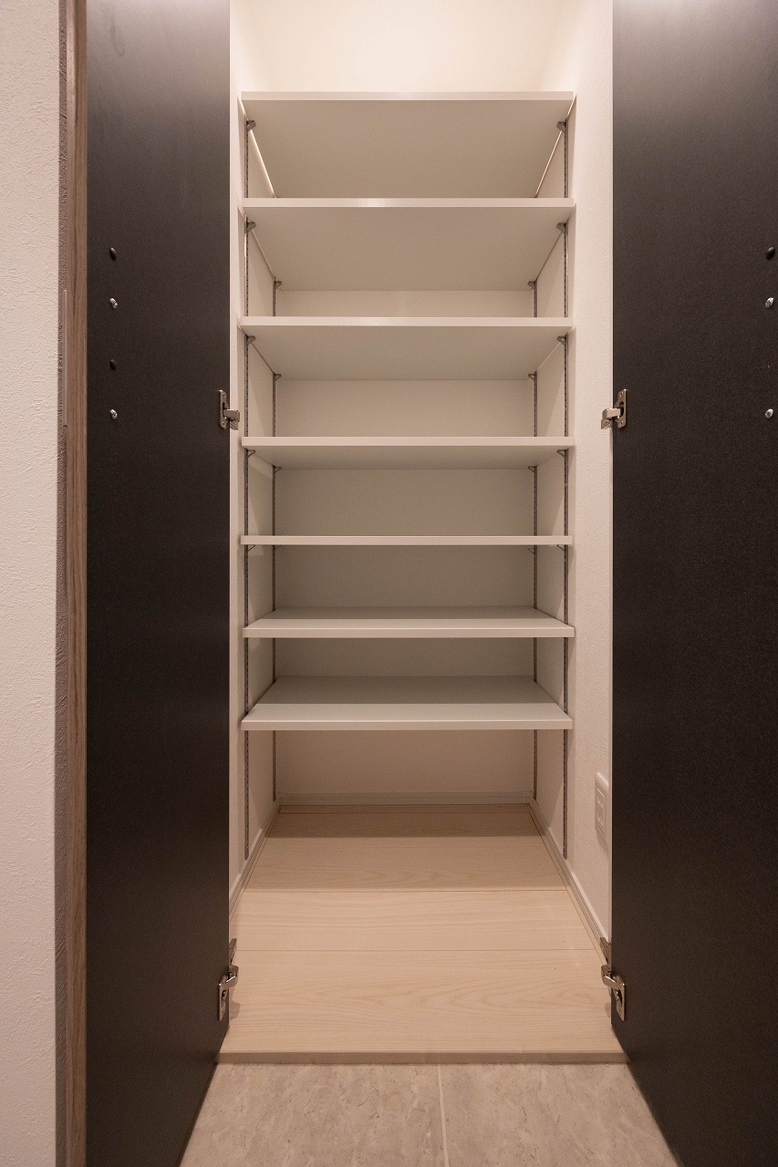 玄関にはシューズインクローゼットを配置。靴だけでなく、アウトドア用品やスポーツ用具まで一か所に集約できる計画とし、室内へ視線が抜ける場面でも整った印象を保てる構成としている。加えて、各所にクローゼットやウォークインクローゼットを設け、収納量に対する不安を軽減。暮らし始めてからの不足が生じにくい計画としている。