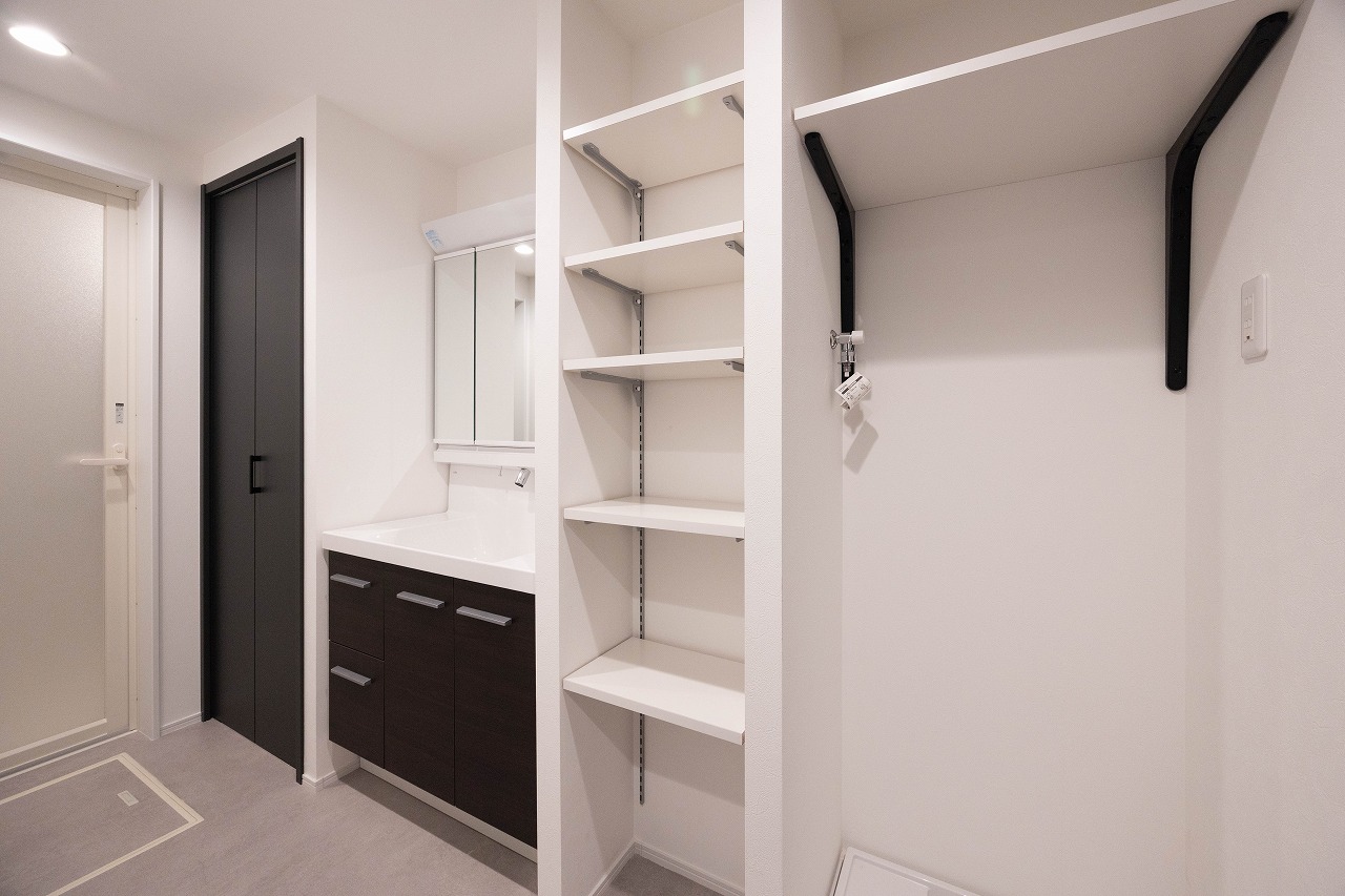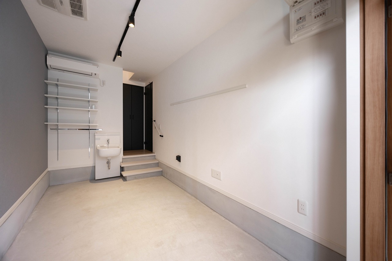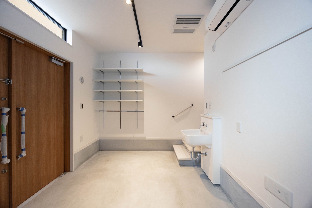 1階には約6帖の専用バイクガレージを設置。換気装置・エアコン・電源・照明・シンク・可動棚を標準装備し、季節を問わずメンテナンス作業ができる環境を整えている。「バイクと共に暮らす」ことを前提とした空間であり、単なる駐輪スペースではない。