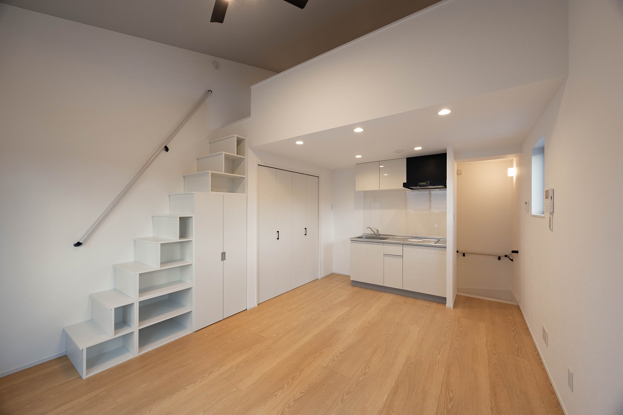2階には10〜11帖の居住スペースを確保。IHシステムキッチンや大型クローゼットを配置し、ゆとりを感じられる広さとしている。ロフトへは揺れにくい家具階段を採用し、階段自体も収納として活用可能。高さ約1.4mのロフトには照明とコンセントを備え、収納にとどまらず多用途に使える空間としている。