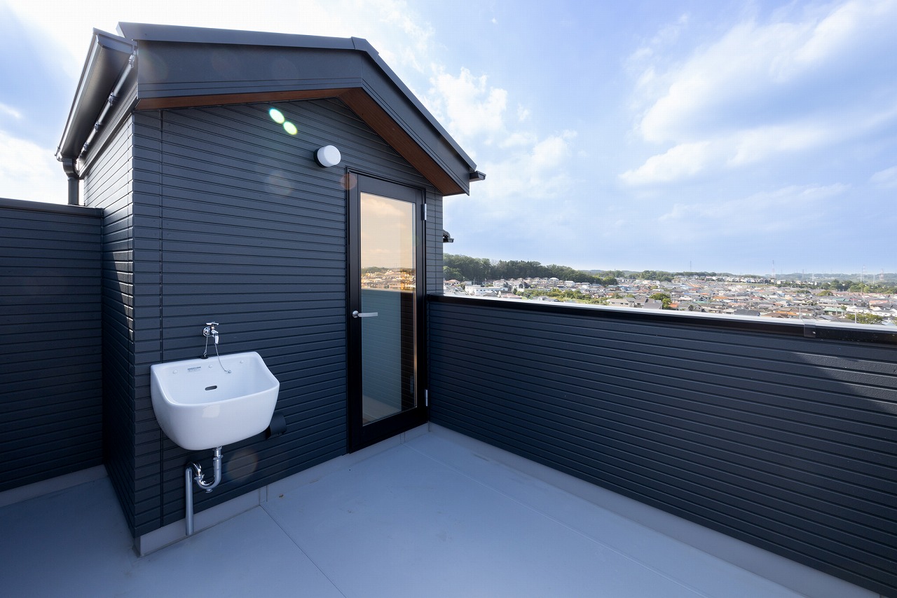 さらに、この住宅の特徴の一つがルーフバルコニーだ。シンクと照明を備えており、屋外での食事やバーベキューなどにも対応できる。周囲の視線を気にしにくい環境で、自宅にいながら屋外空間を楽しめる。