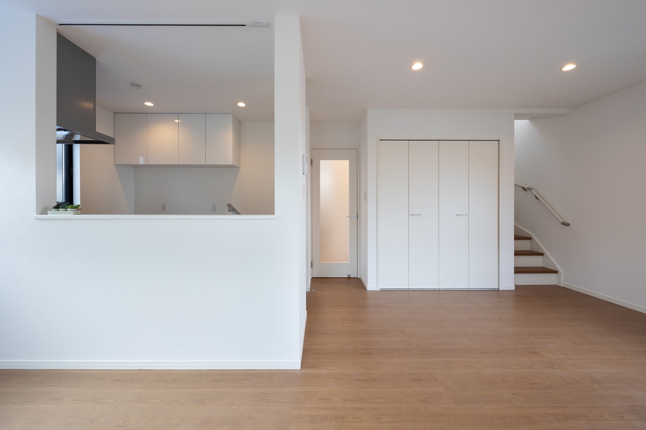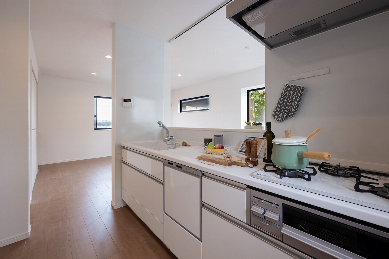 キッチンは半個室タイプの対面式キッチン。リビングとのつながりを保ちながら、ゆるやかに空間を仕切るレイアウトになっている。キッチンスペースの入口には後からゲートを設置しやすい設計となっており、小さな子どもやペットがいる家庭でも使いやすい。