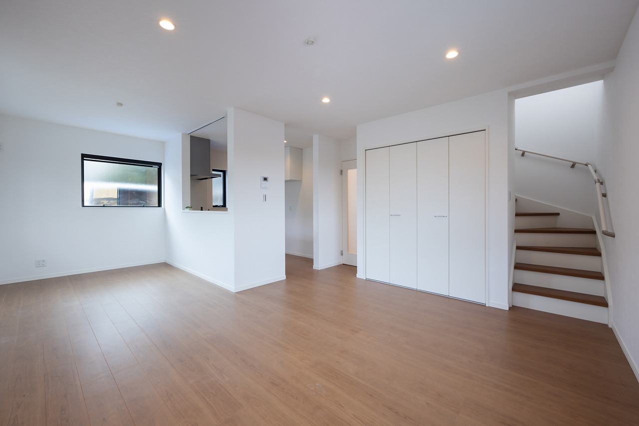 リビングには大型収納を設け、掃除道具や季節用品などの保管場所として活用できるよう計画されている。日常的に使うものを生活空間の近くにまとめることで、室内をすっきり保ちやすい構成だ。