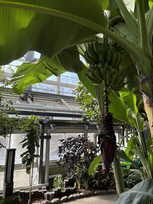 濃い紫色の大きな花が下に垂れ下がっていて、まるで巨大なつぼみのよう。 実際に見ると「これが普段食べているバナナになるのか」と不思議な気持ちになりました。