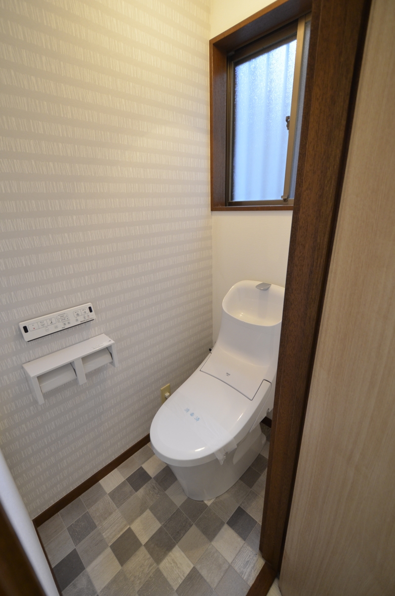 古い型だったトイレをタンク一体型に新規交換しました。 併せて、クロスやタオルリング、紙巻器なども...