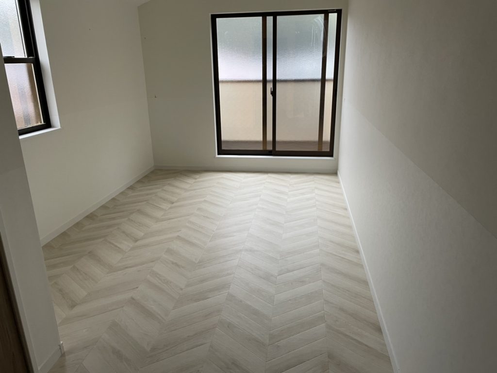 床材はヘリンボーン柄クッションフロアを採用。