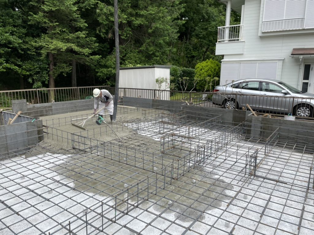 基礎配筋完了後、コンクリート打設を実施。
