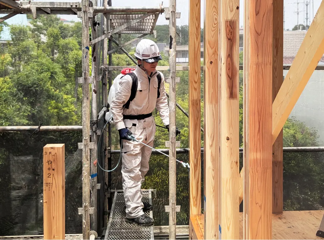 シロアリや害虫、カビの発生を防ぐため、柱・梁・床・壁・天井へホウ酸処理を施しています。ホウ酸は哺乳類への安全性が高く、愛犬と暮らす住まいでも安心して採用できる素材です。長期的な住環境を守るために、目に見えない部分にも配慮しています。